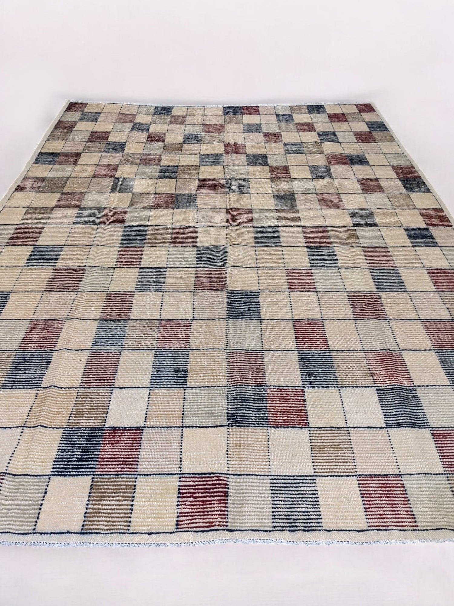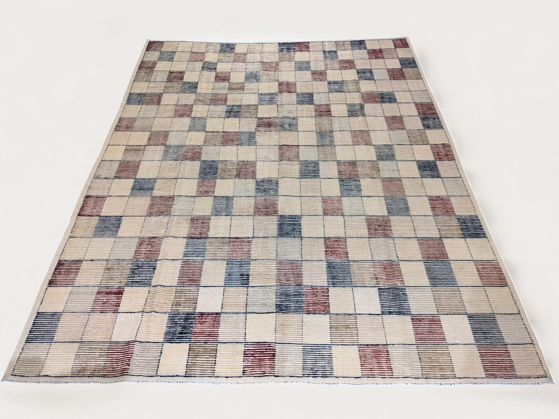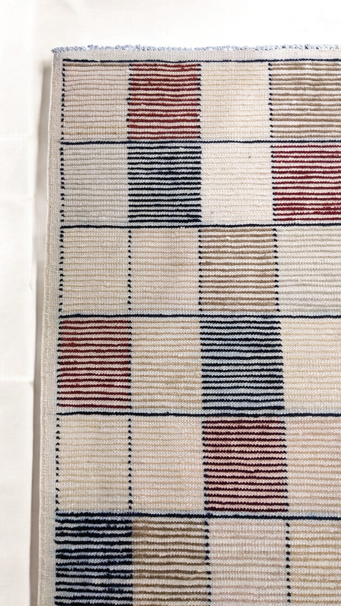 This rug showcases a contemporary, well-defined look through its crisp plaid pattern in subdued beige, blue, and red shades. The alternating squares, adorned with detailed linear motifs, provide texture and visual depth, reinforcing its modern design. Its flat-woven construction and short fringe contribute to durability, making it ideal for adaptable living spaces. The rug offers a timeless yet revitalizing accent to any interior.