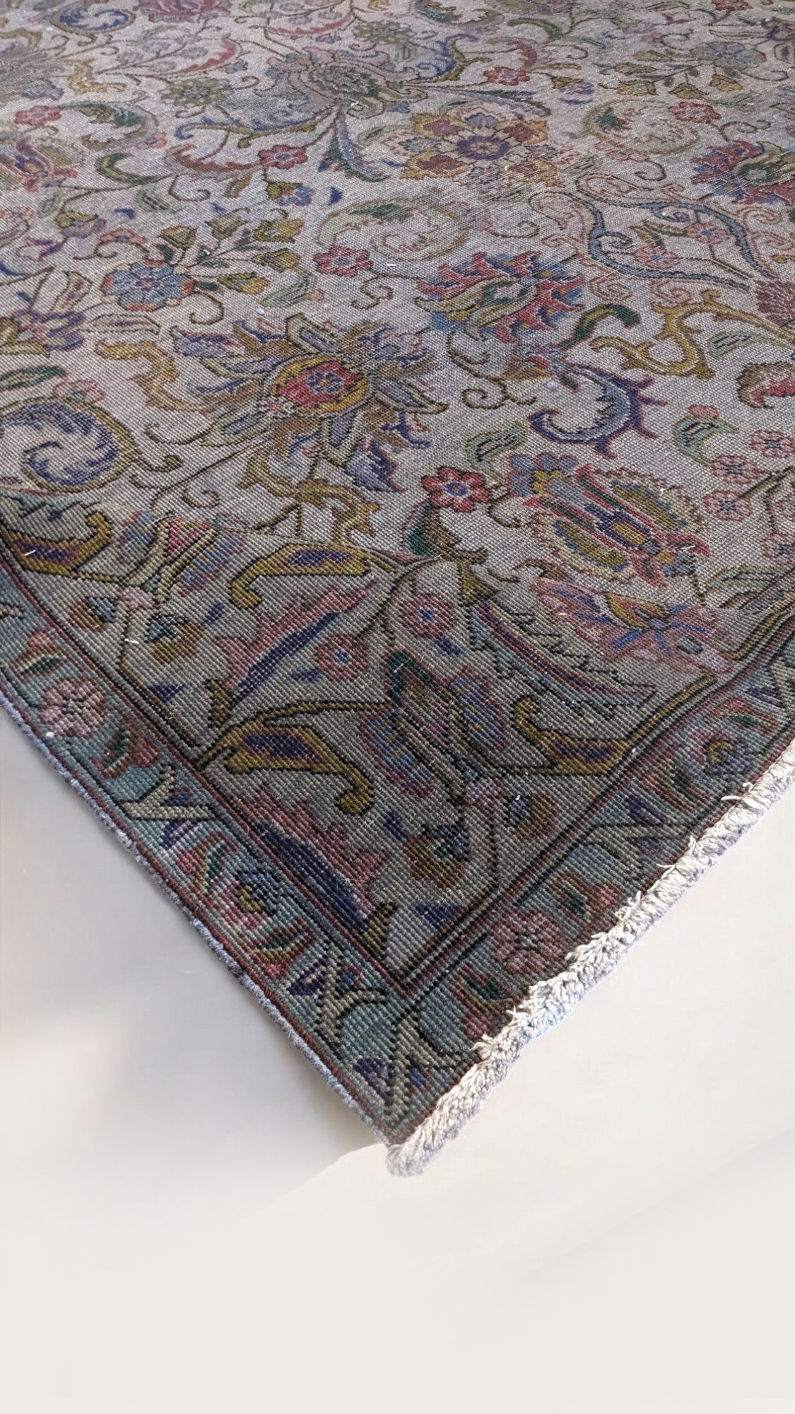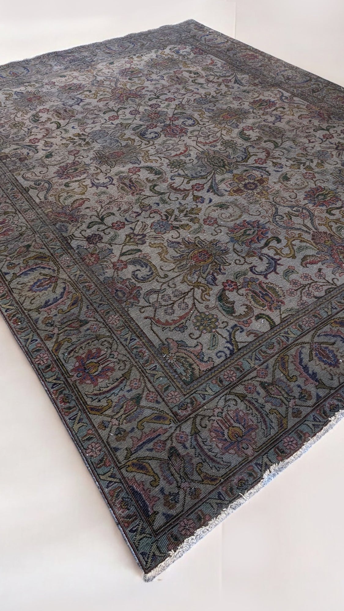 Vintara brings vintage charm to life with its muted palette of dark colors softened by hints of cream and faded blue-gray. Hand-knotted in the Persian tradition, this zero-pile wool rug features an intricate all-over floral design, elegantly distressed for a timeworn, lived-in beauty. Carefully hand-selected by our owner for its rich character and subtle sophistication, Vintara offers a quietly dramatic statement, perfect for refined, soulful spaces.