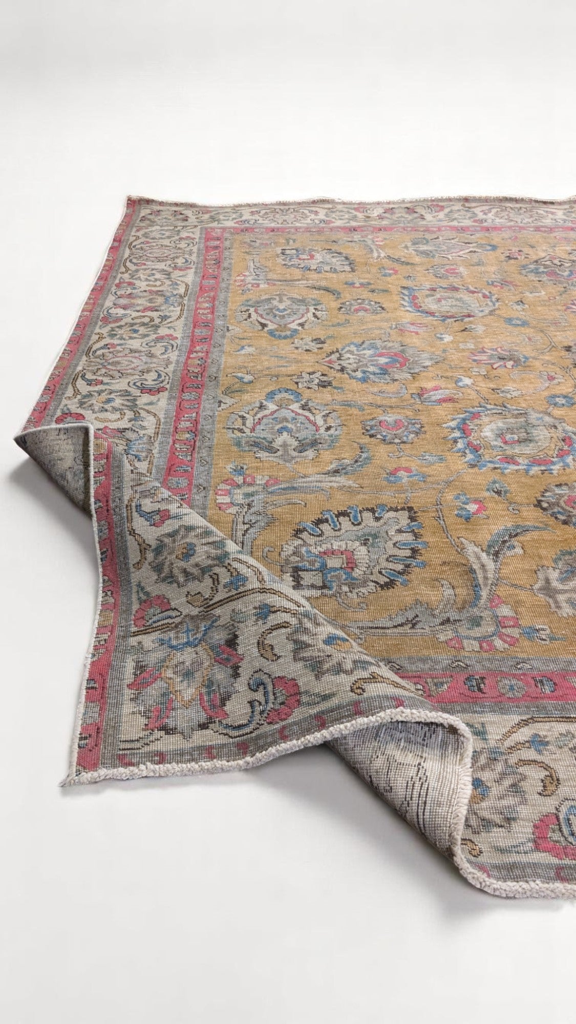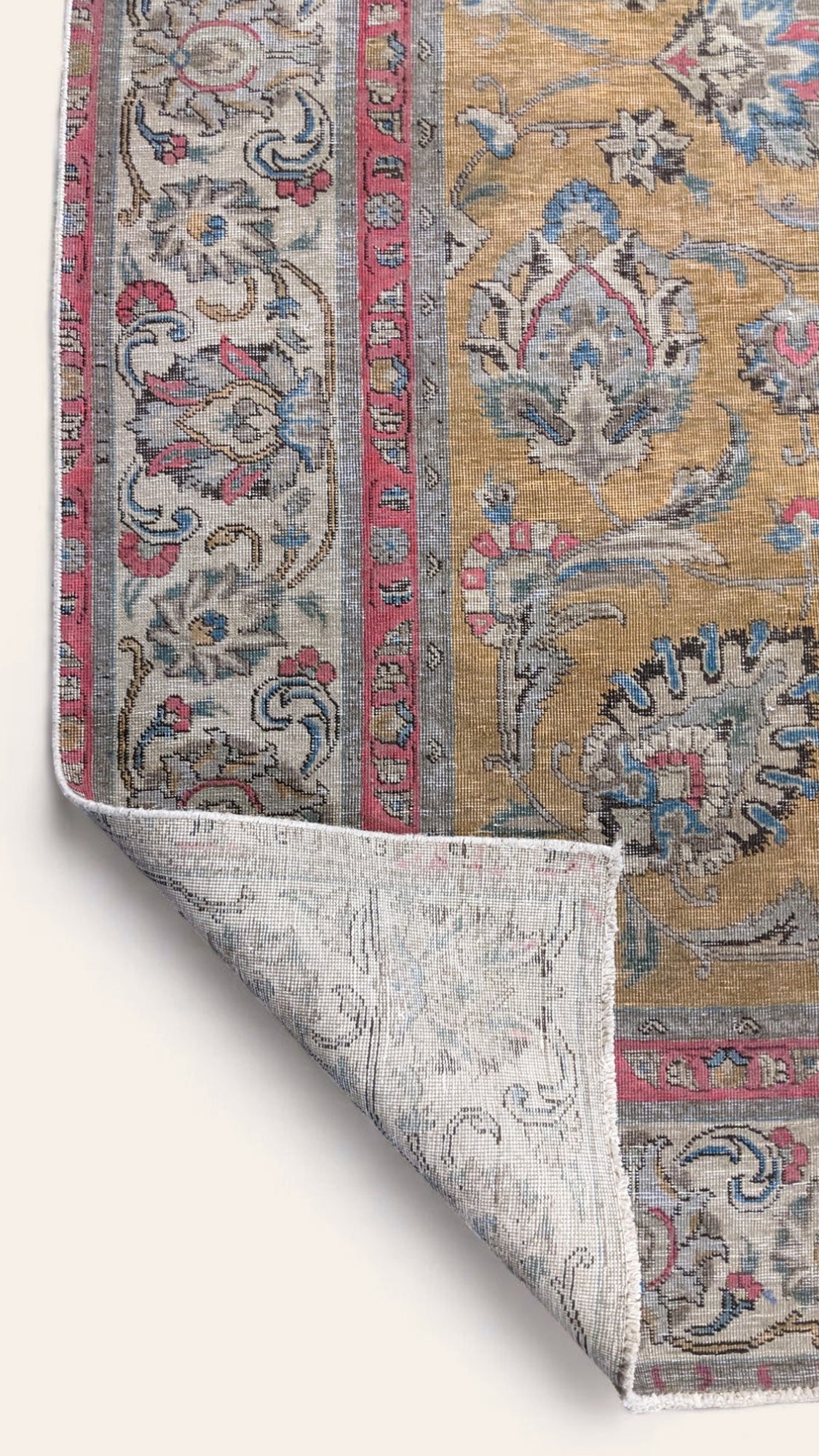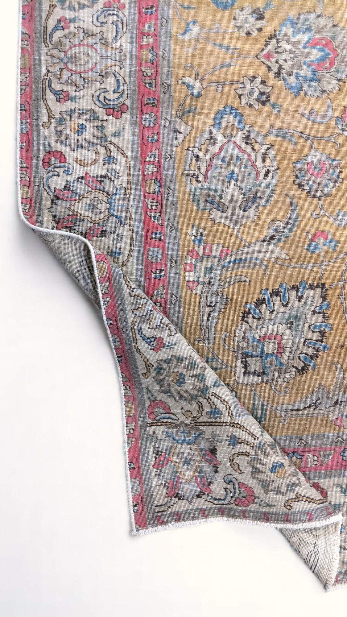This hand-knotted wool rug features a warm golden beige background with a detailed Persian floral design. Its layered, faded borders add vintage charm, while the construction highlights classic craftsmanship.