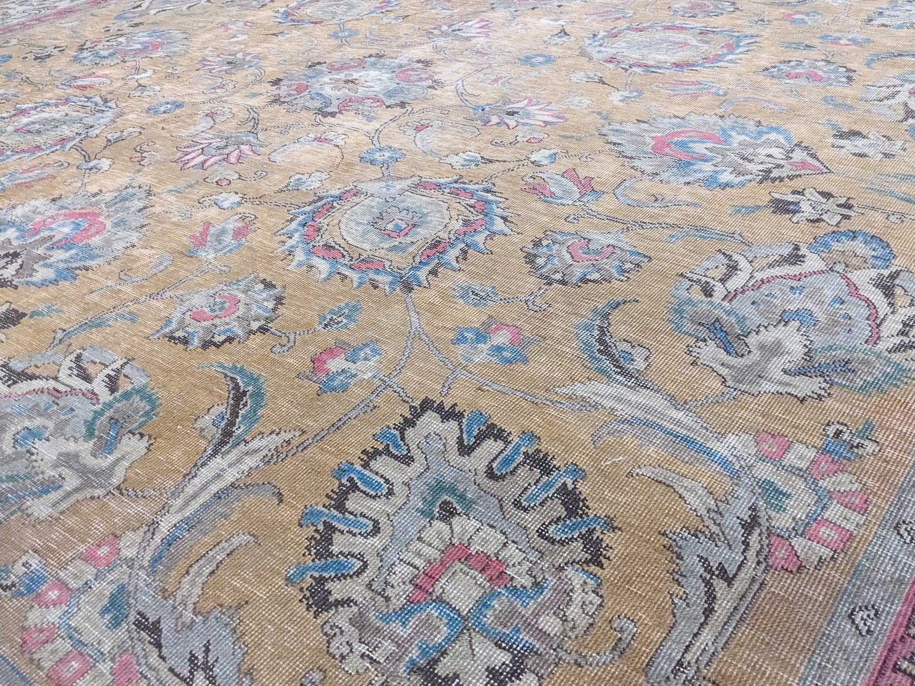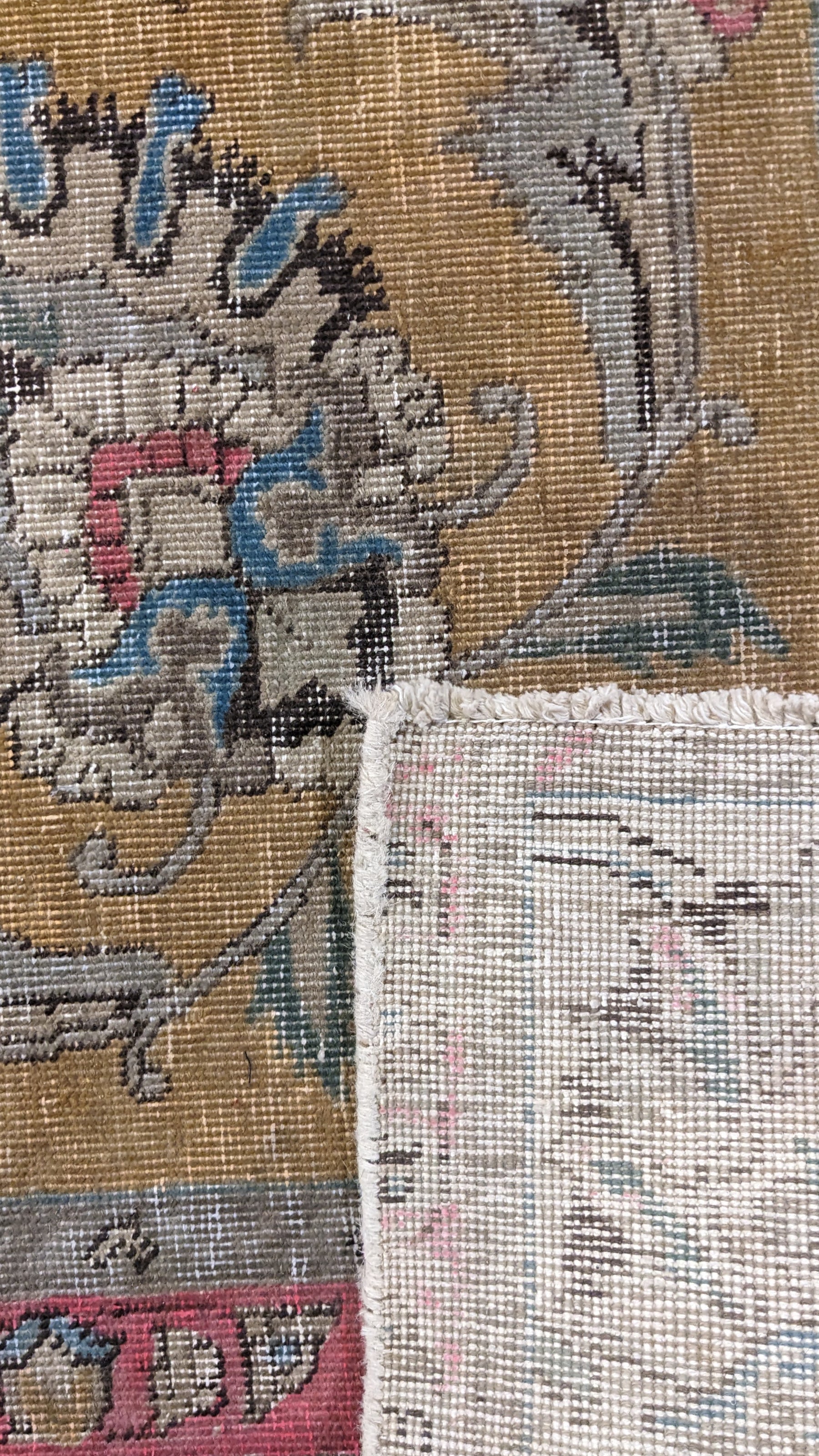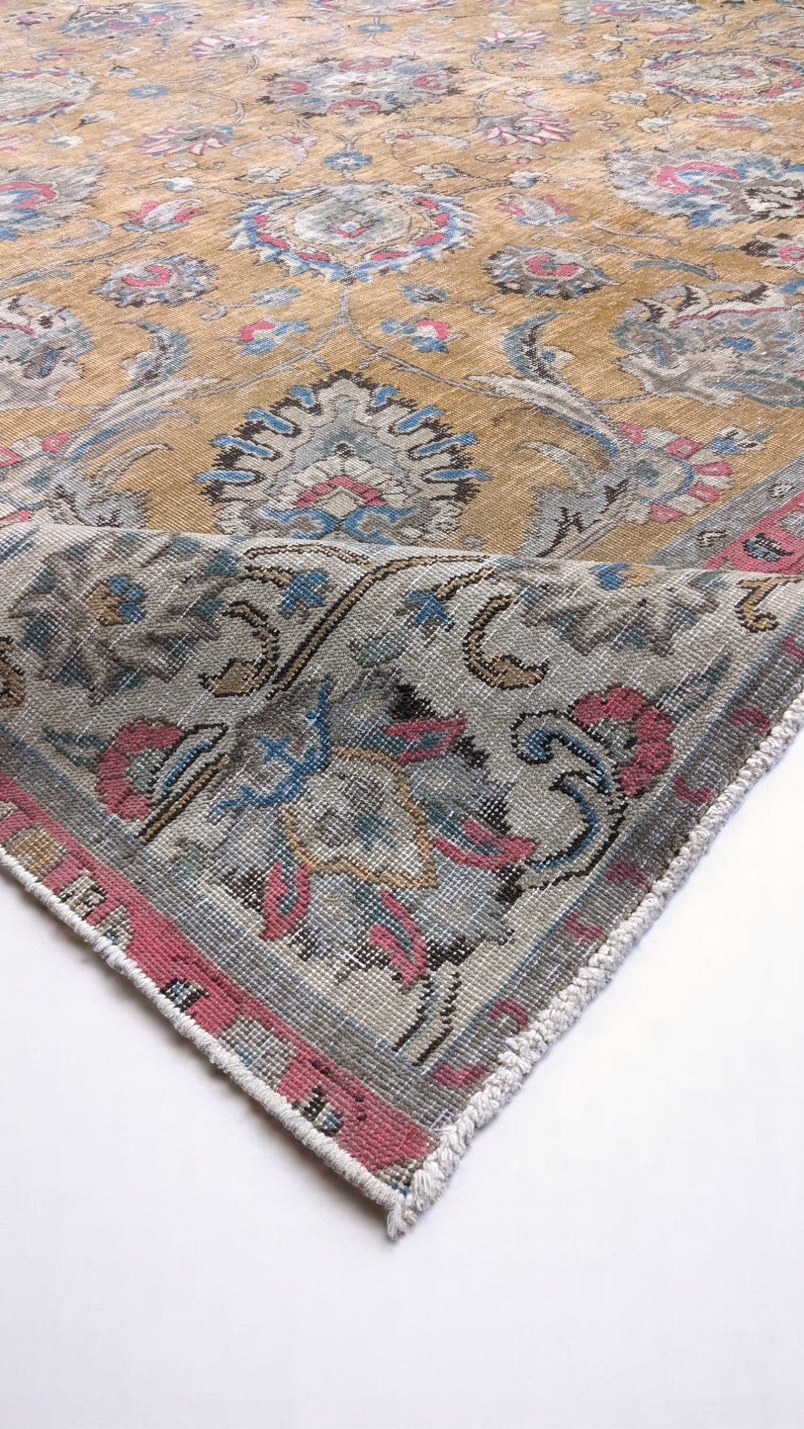 This hand-knotted wool rug features a warm golden beige background with a detailed Persian floral design. Its layered, faded borders add vintage charm, while the construction highlights classic craftsmanship.