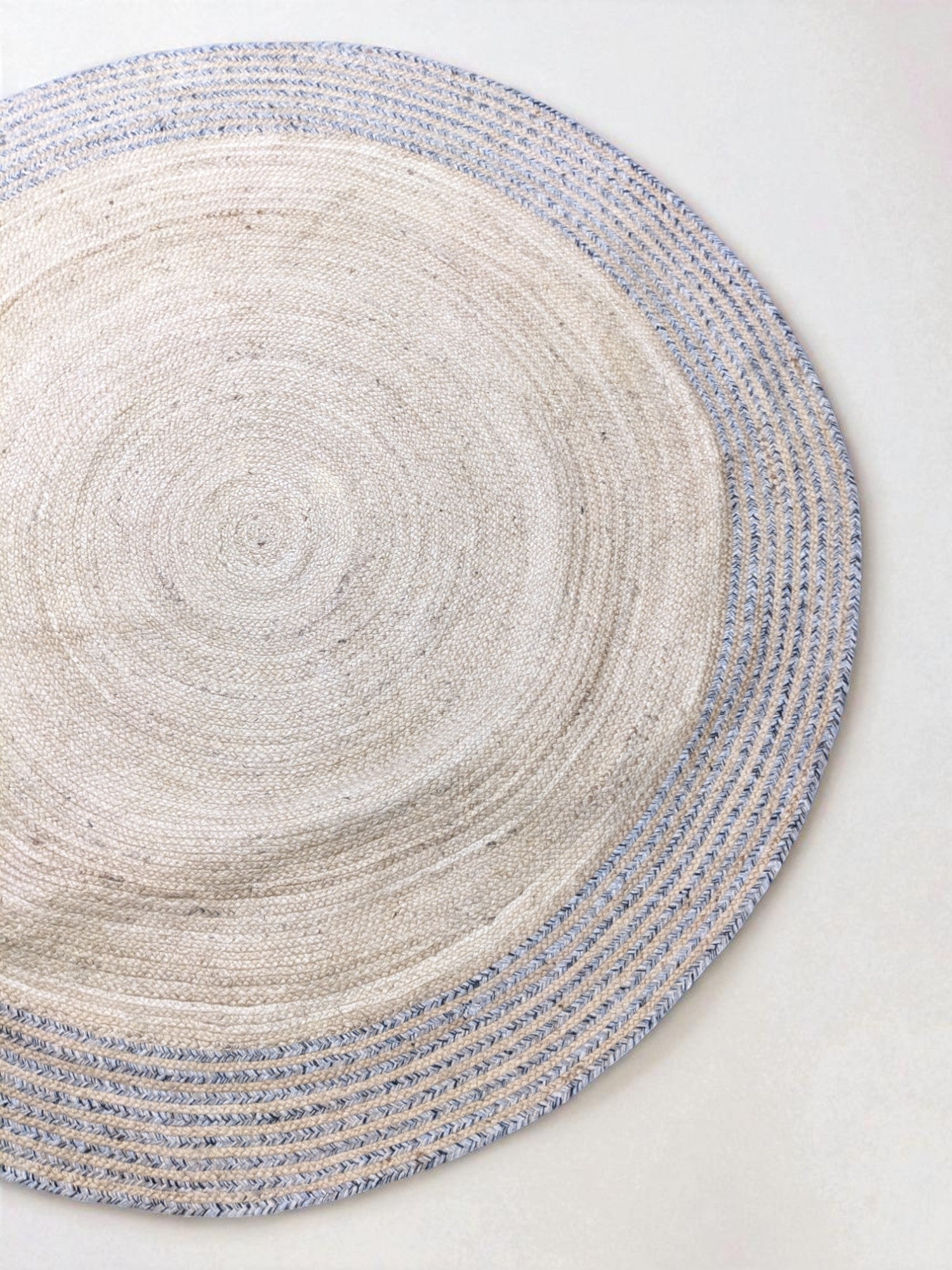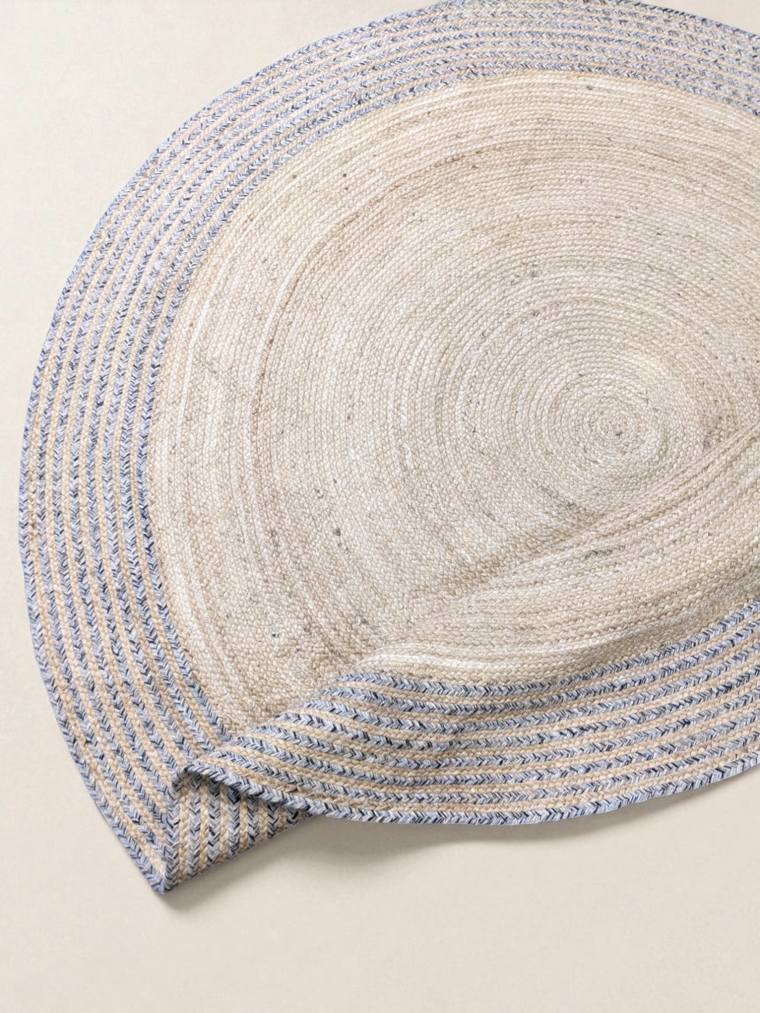 This rug introduces a natural element to your interior with its round shape crafted from authentic jute fibers. The woven texture showcases an engaging concentric circle motif, featuring subtle shifts in light brown and tan hues. Its clean, infringed borders emphasize a rustic, bohemian aesthetic, ideal for infusing warmth and an organic feel into any room.