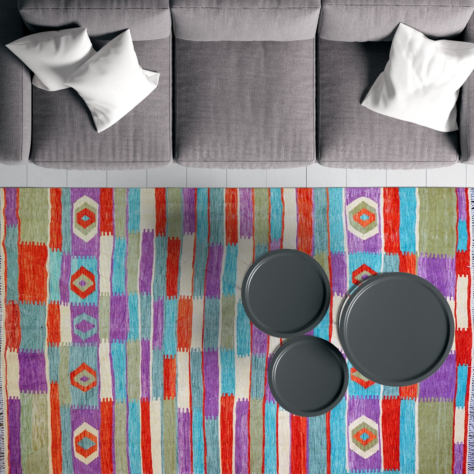 Each rug is a unique, hand-knotted work of art with traditional symbols, this Afghani Chobi Kilim will bring warmth and character to any space. A flatwoven kilim carpet, it is both durable and a natural water-repellent material that lasts for many years. Natural soil-repellant, this kilim rug is durable and can be used on both sides of the weaving. The Afghani Chobi Kilim has the following qualities: