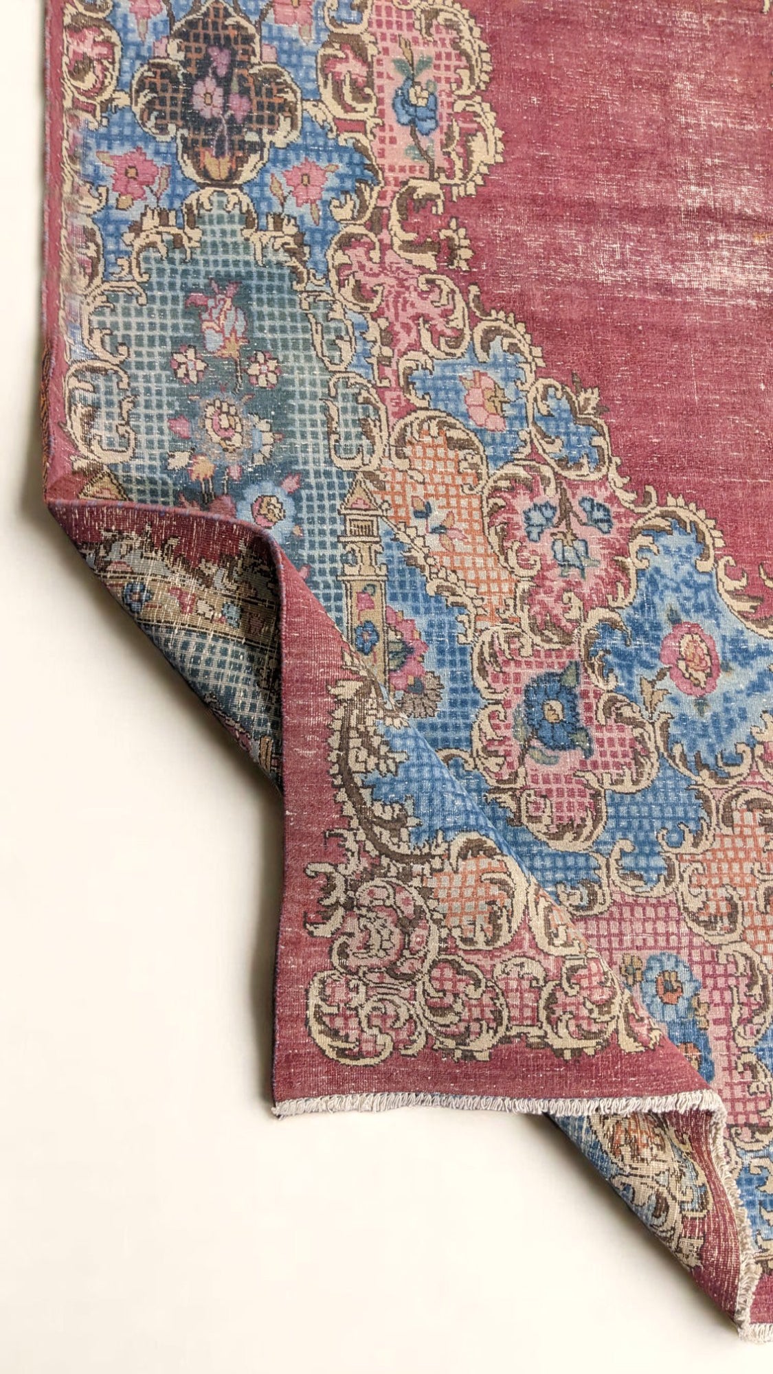 Aubuson is a celebration of color and craftsmanship, drenched in a regal plum-red field with sky-blue and blush accents. Its intricate medallion and ornate corner motifs evoke the romance of antique Persian designs, hand-knotted in wool and softened through a vintage wash. The zero-pile texture highlights every detail, giving this piece a rich, timeworn elegance.