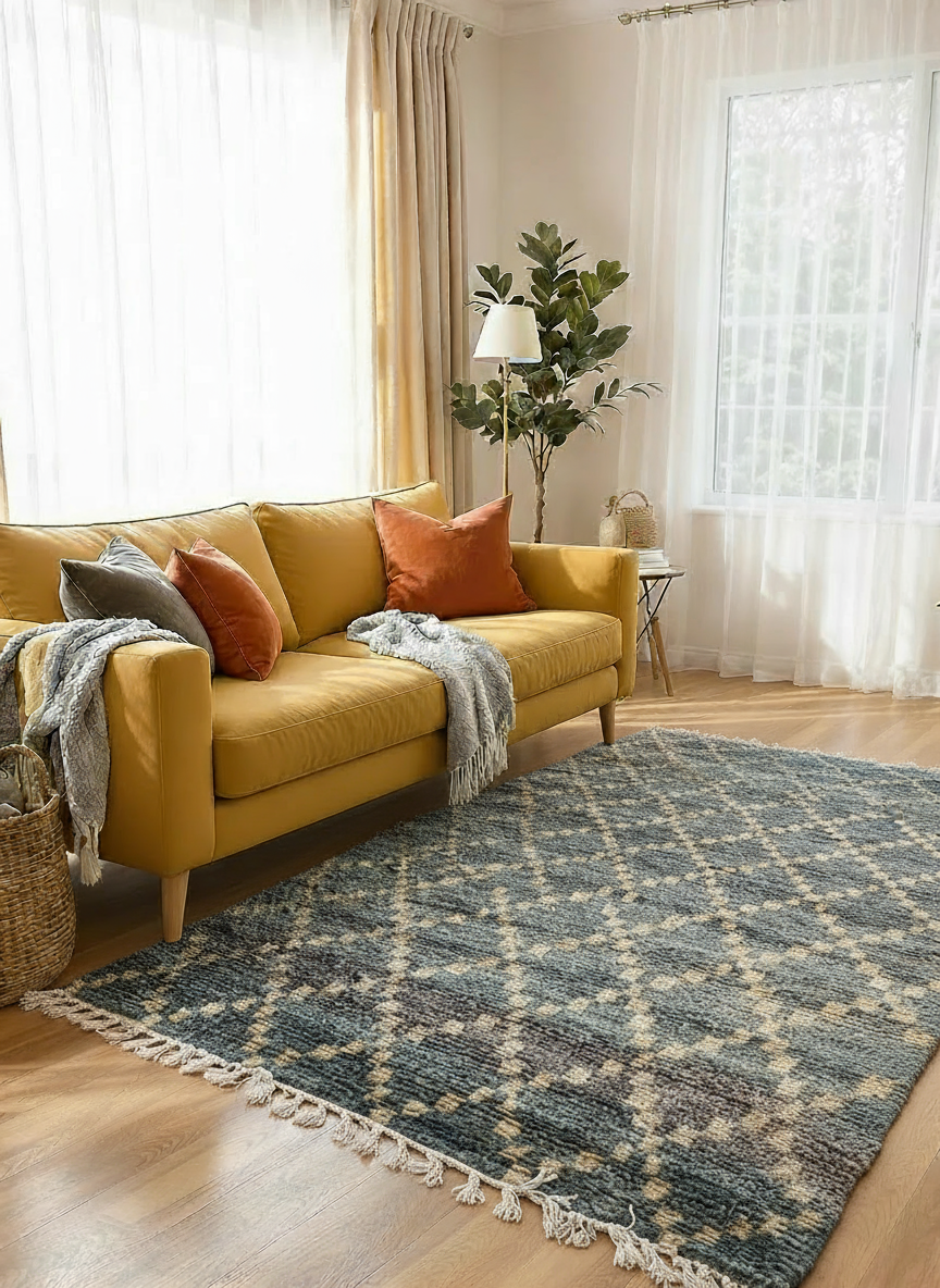 Handmade rugs by Ahsan Imam in natural and neutral tones, capturing the serene beauty of earthy desert landscapes.