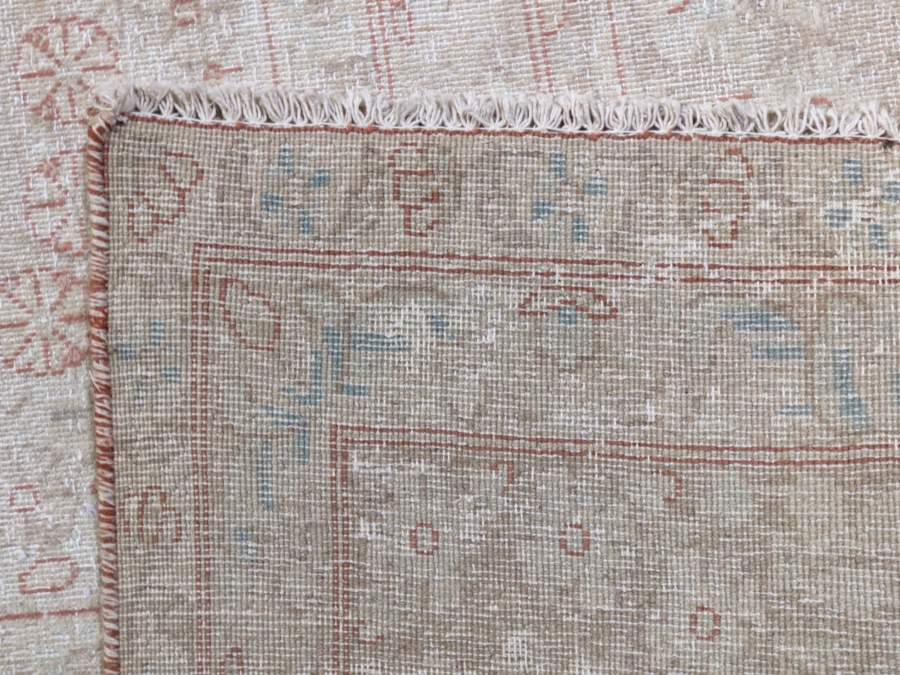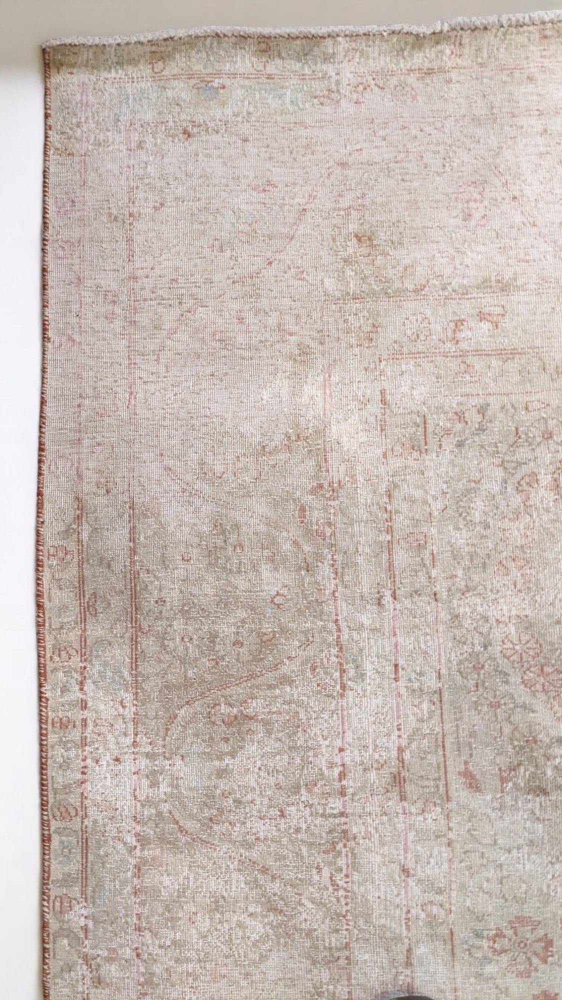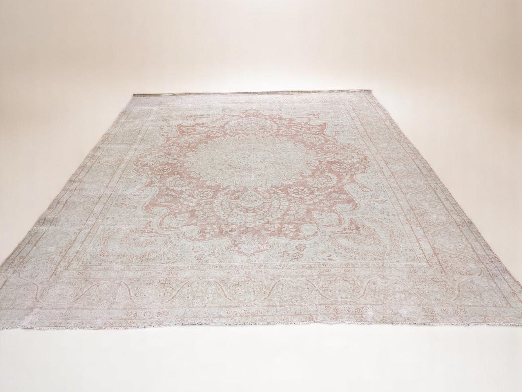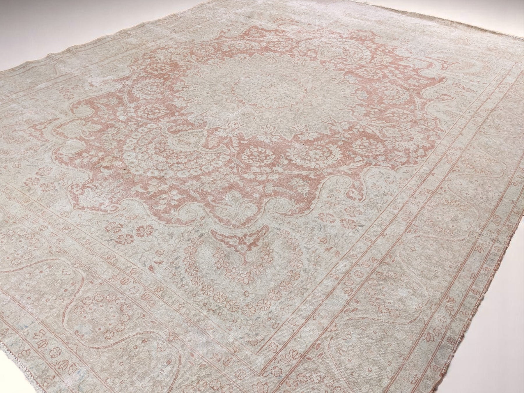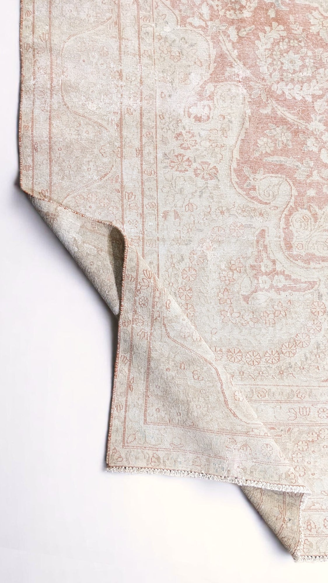 This Persian vintage rug, in gentle blush and ivory tones, showcases finely detailed medallion and floral patterns beautifully softened over time. Hand-knotted from wool and lightly overdyed, it features a zero-pile texture that lends a peaceful, almost otherworldly quality. The subtle patina and muted colors evoke a timeless elegance, imbuing the piece with a sophisticated, enduring luxury.