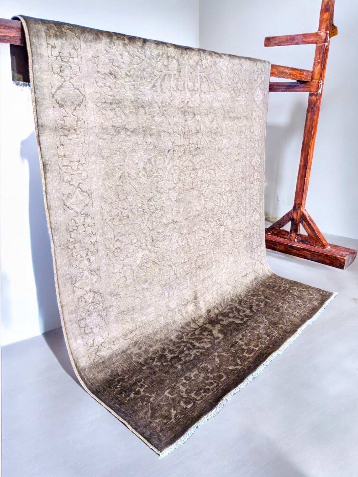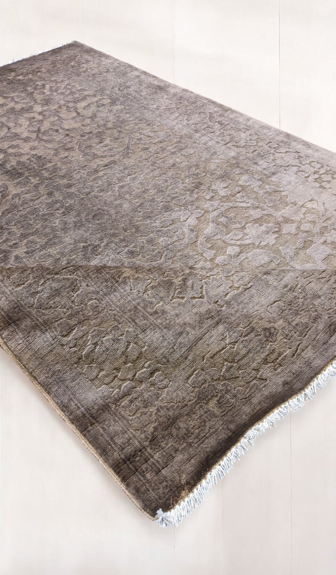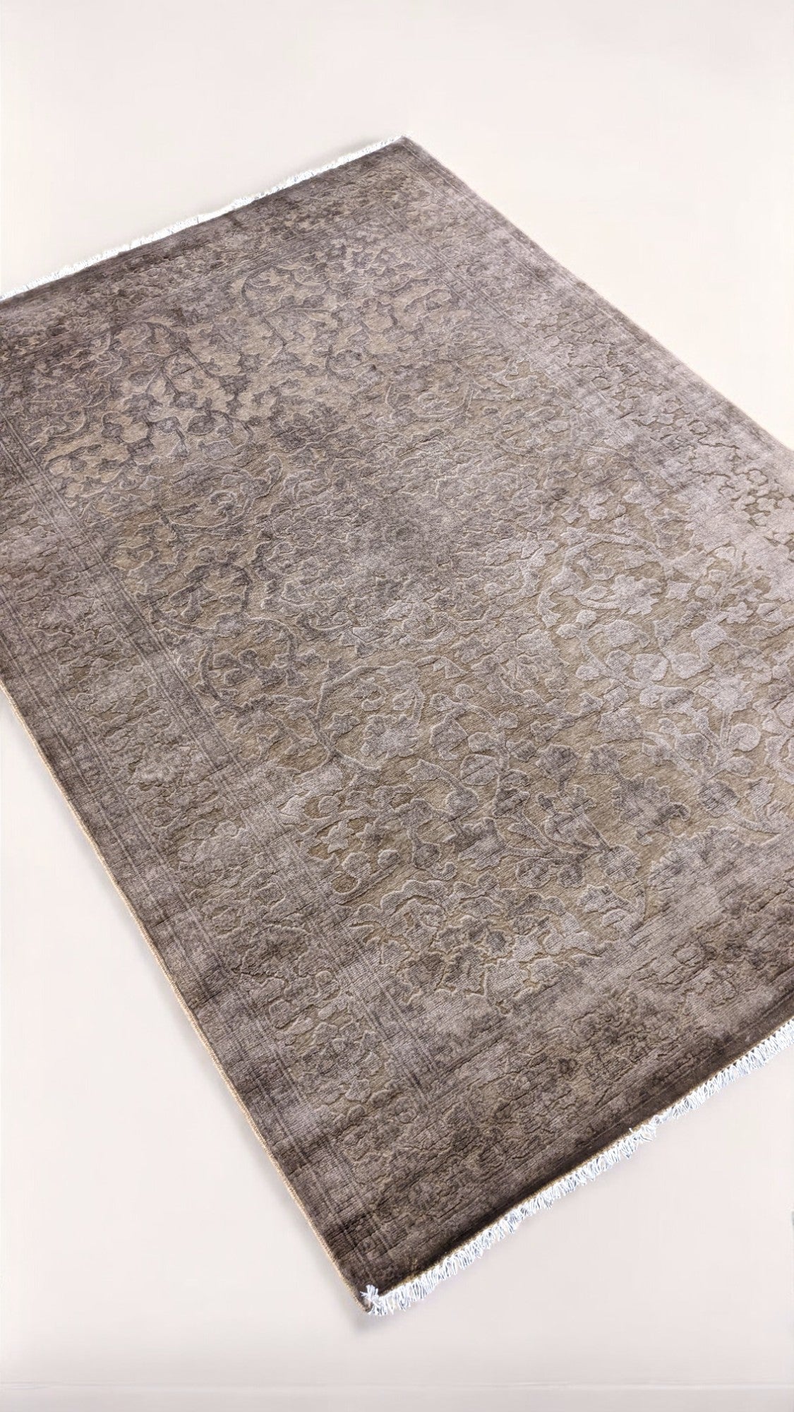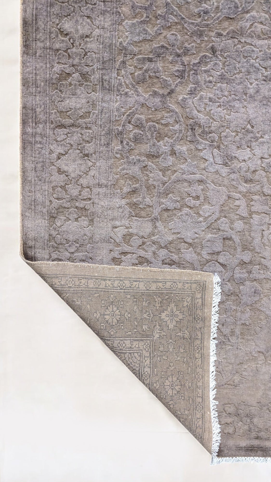 This rug exemplifies subtle sophistication. Expertly hand-knotted in Pakistan using soft wool, it features a harmonious blend of muted grays and beiges with a refined overdyed finish. The surface is adorned with gentle, vine-inspired motifs that create a graceful, flowing design. Completed with classic fringe detailing, it adds a calm and elegant presence to any room.