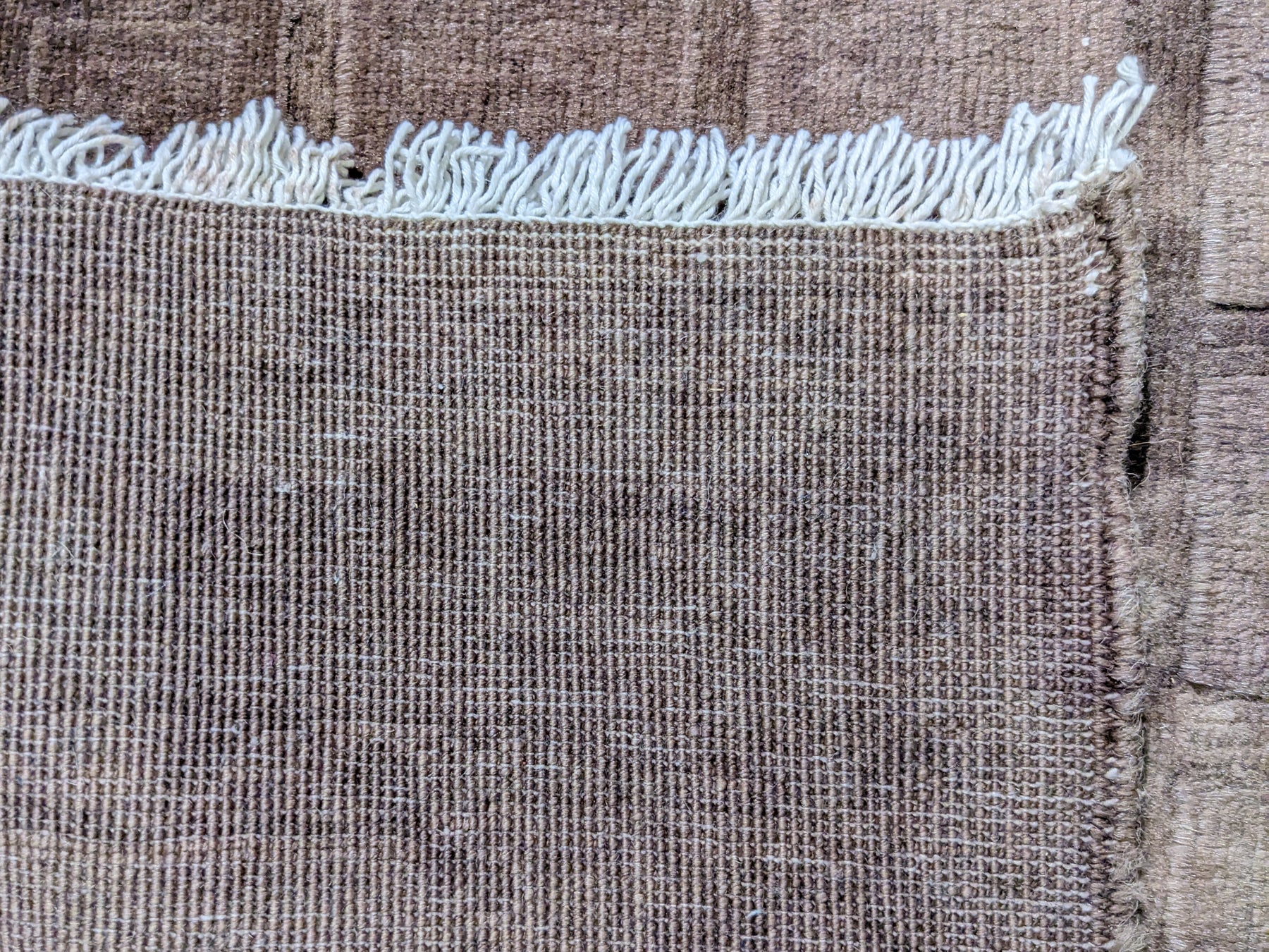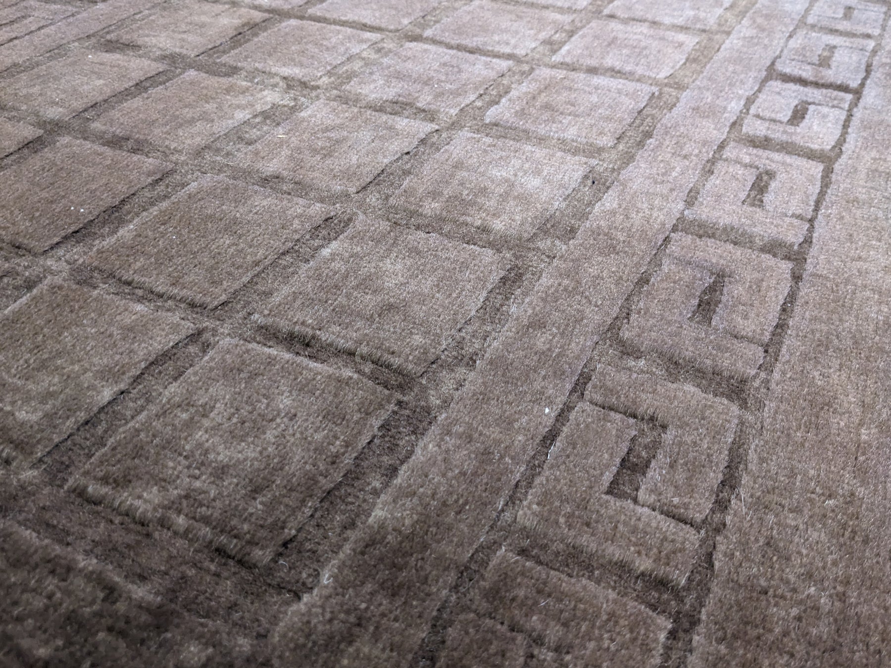 This rug brings a quiet richness to your space. Hand-knotted in Pakistan from pure wool, this deep brown rug showcases an embossed grid and a bold Greek key border that reveals itself subtly in changing light. The tone-on-tone texture adds a soft sculptural quality, making it both grounding and elegant.
