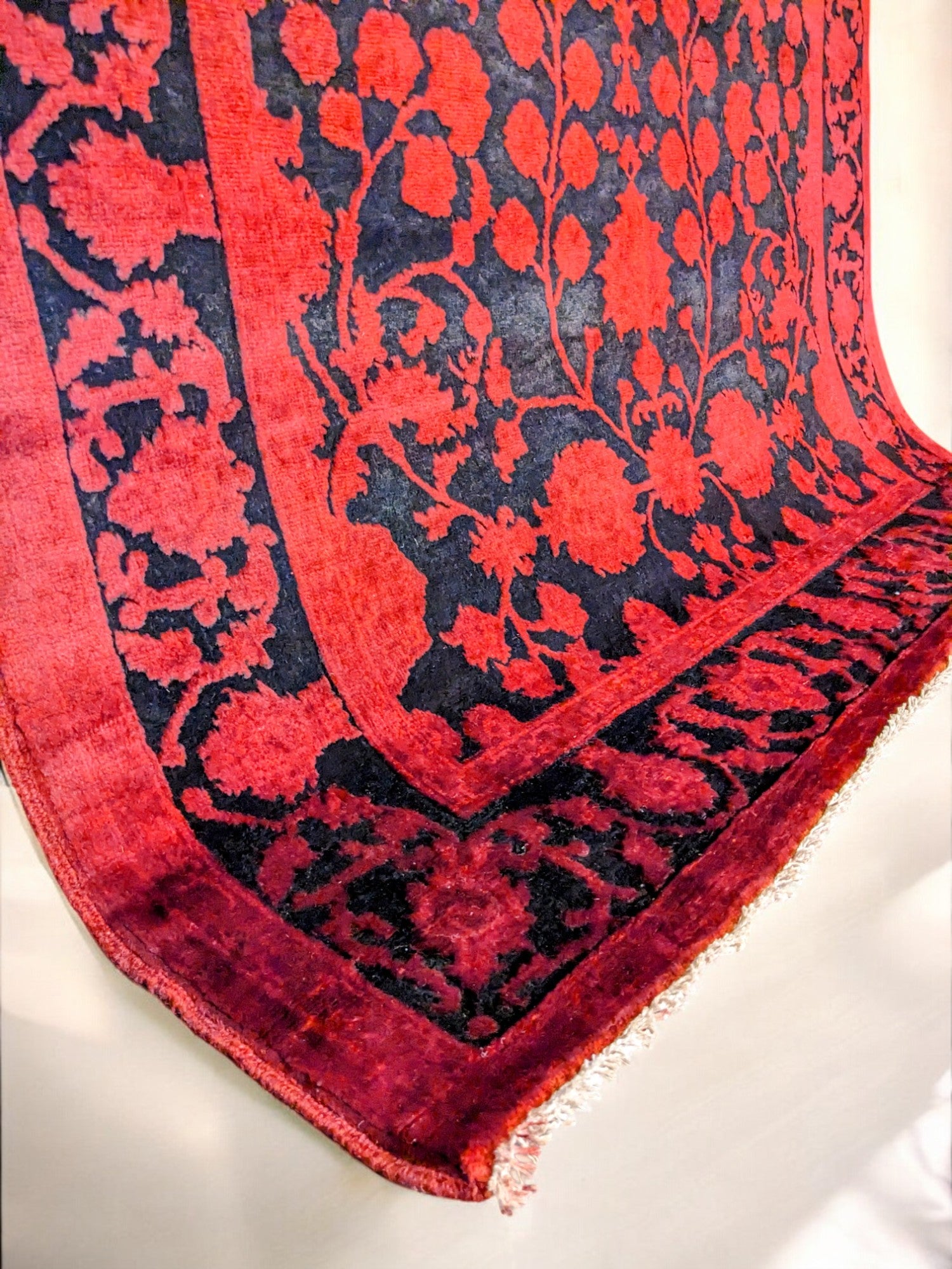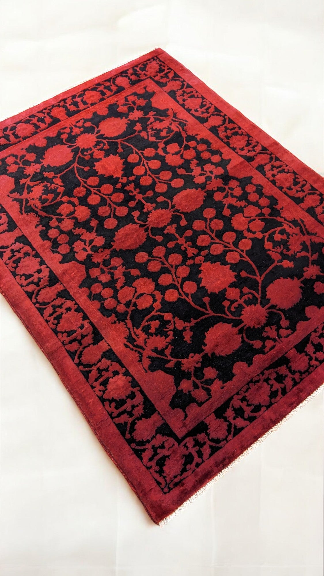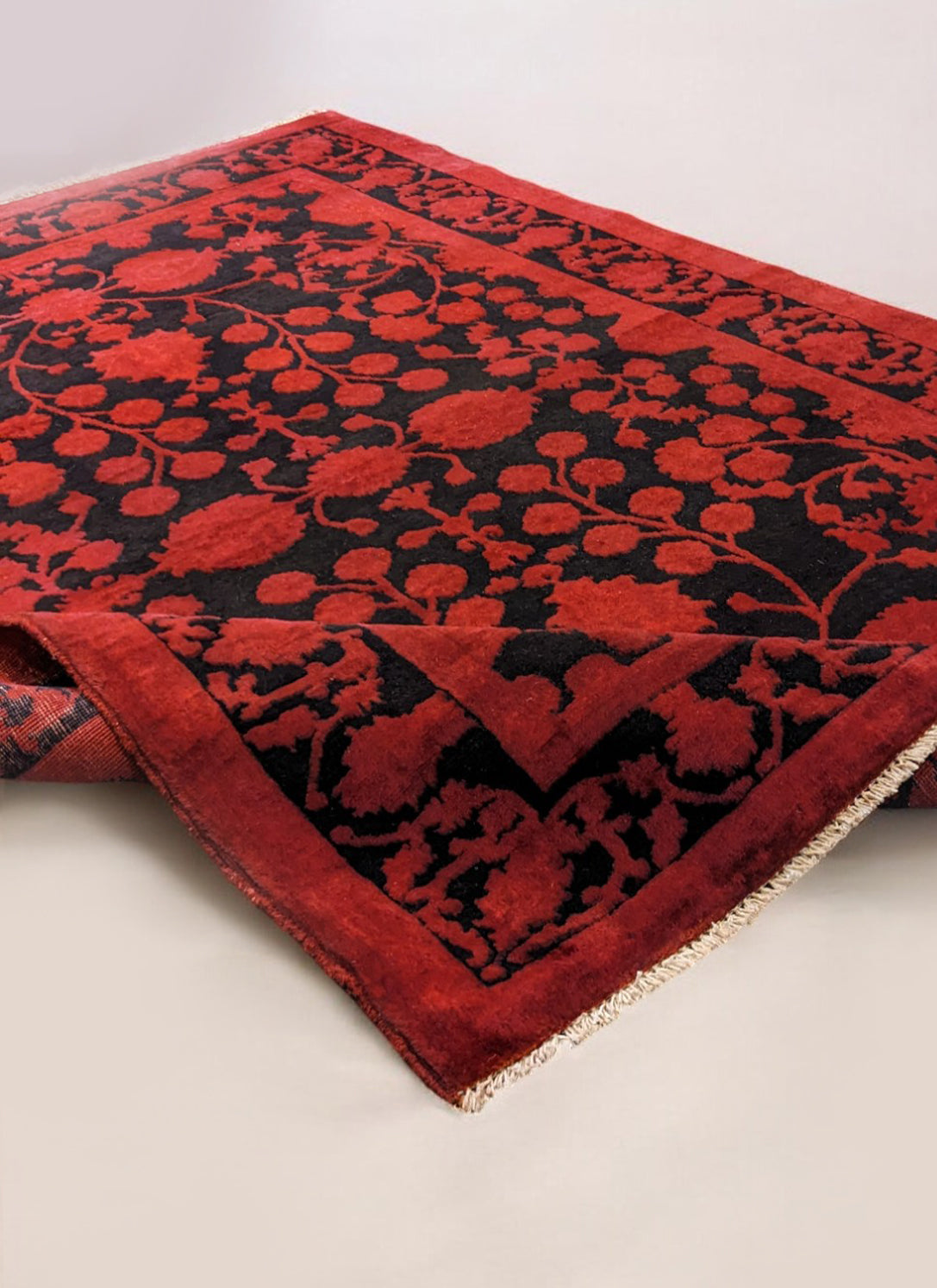 This hand-knotted wool rug features a vibrant, distressed red background accented by bold black floral patterns that demand notice. Rooted in traditional designs, it combines heritage motifs with a deep, over-dyed finish that adds a contemporary, dramatic flair. The soft fringe detail completes the piece, offering a subtle nod to classic craftsmanship.
