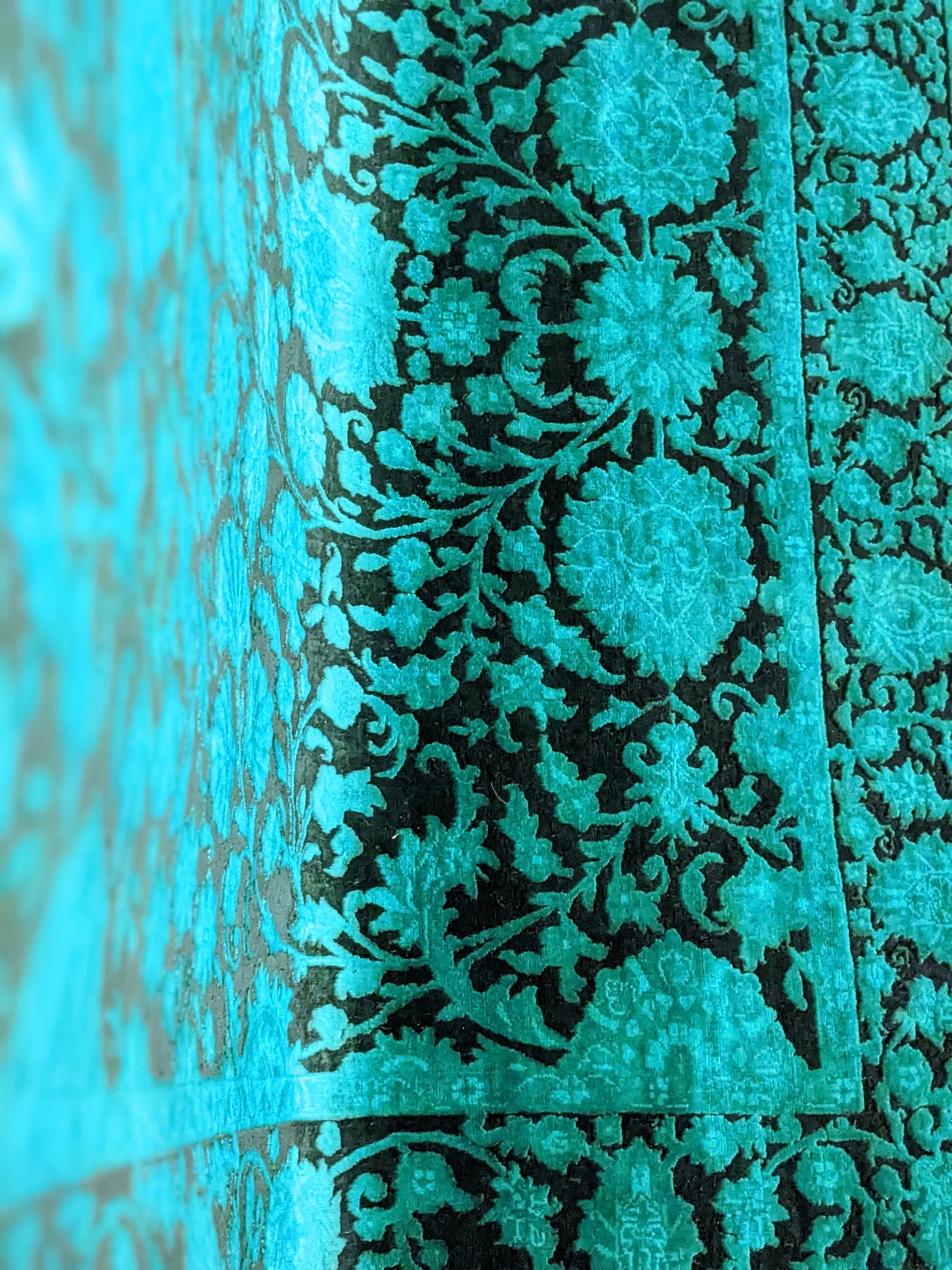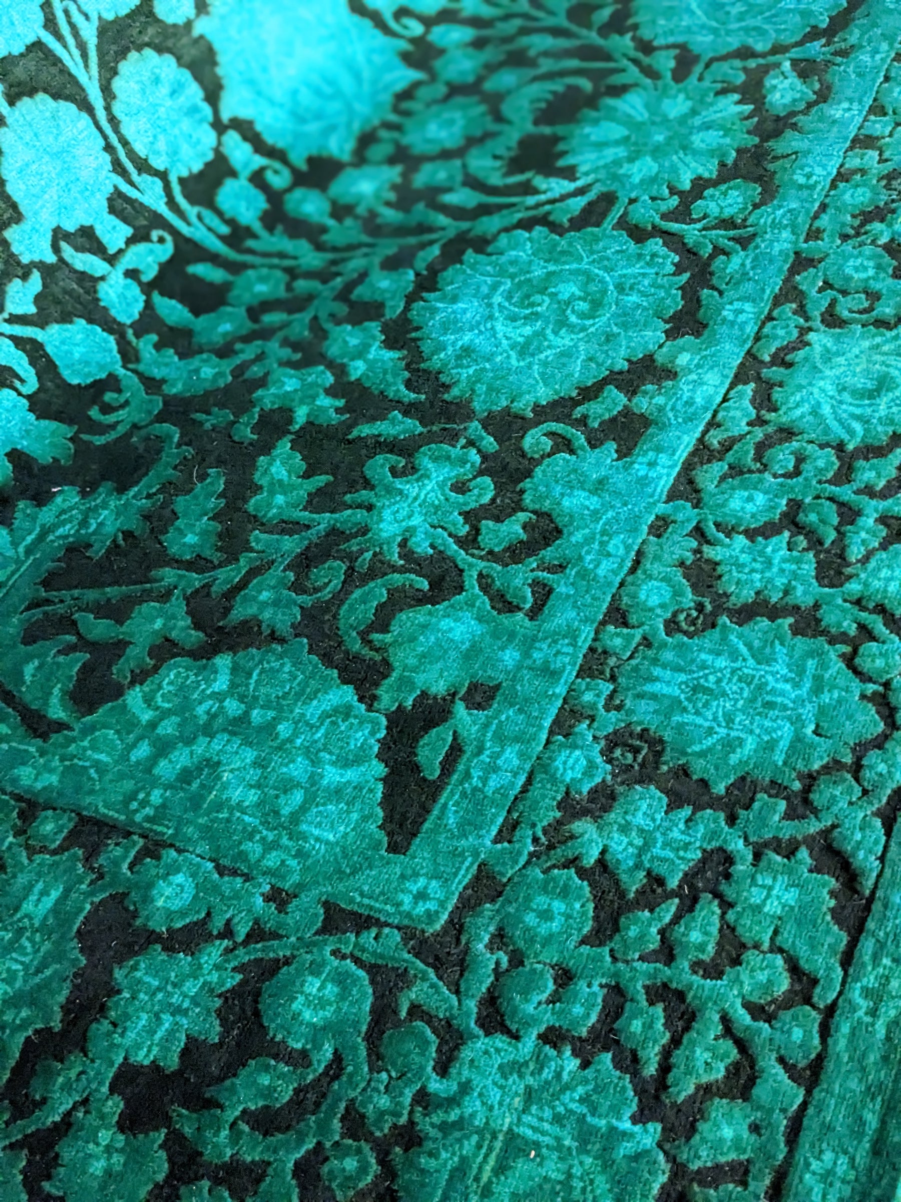 This makes a statement with its bold contrast of dark green and vibrant teal. Featuring large, stylized Ziegler florals and a prominent border, this Embossed wool pile delivers both drama and elegance. The soft wool texture and vibrant colors make it a standout piece for any room.