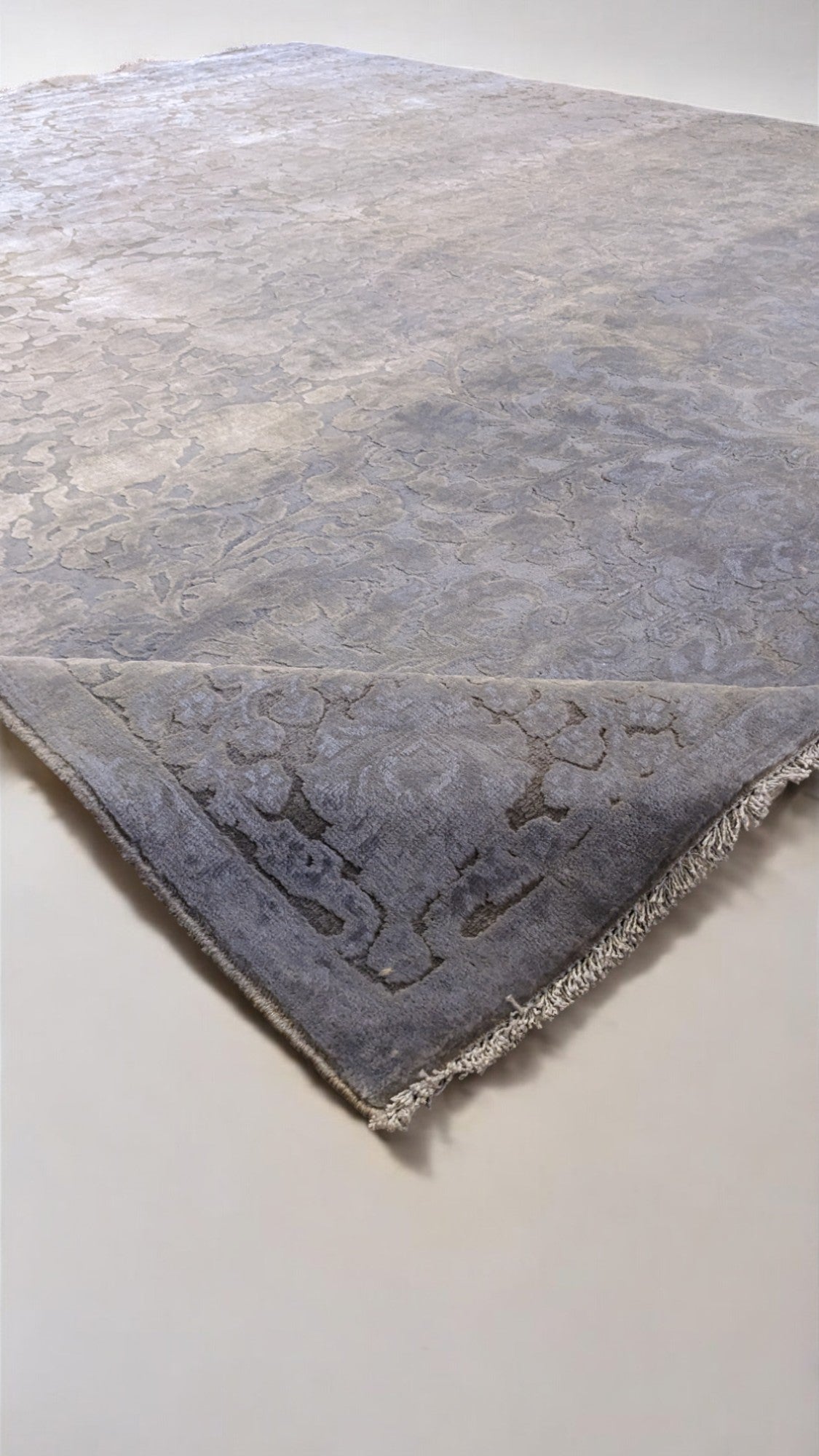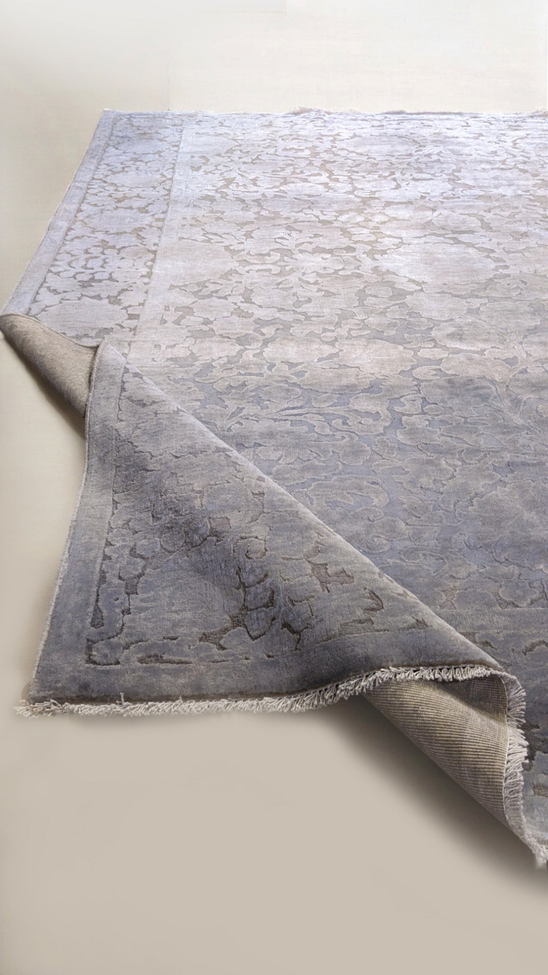 Luxury woven in silk-like softness. A gentle ombre drifts from silver-gray to deep charcoal, while delicate floral motifs ripple across its smooth, low-pile surface. Subtle sheen catches the light, adding depth to its monochrome elegance that's contemporary, refined, and effortlessly stylish.