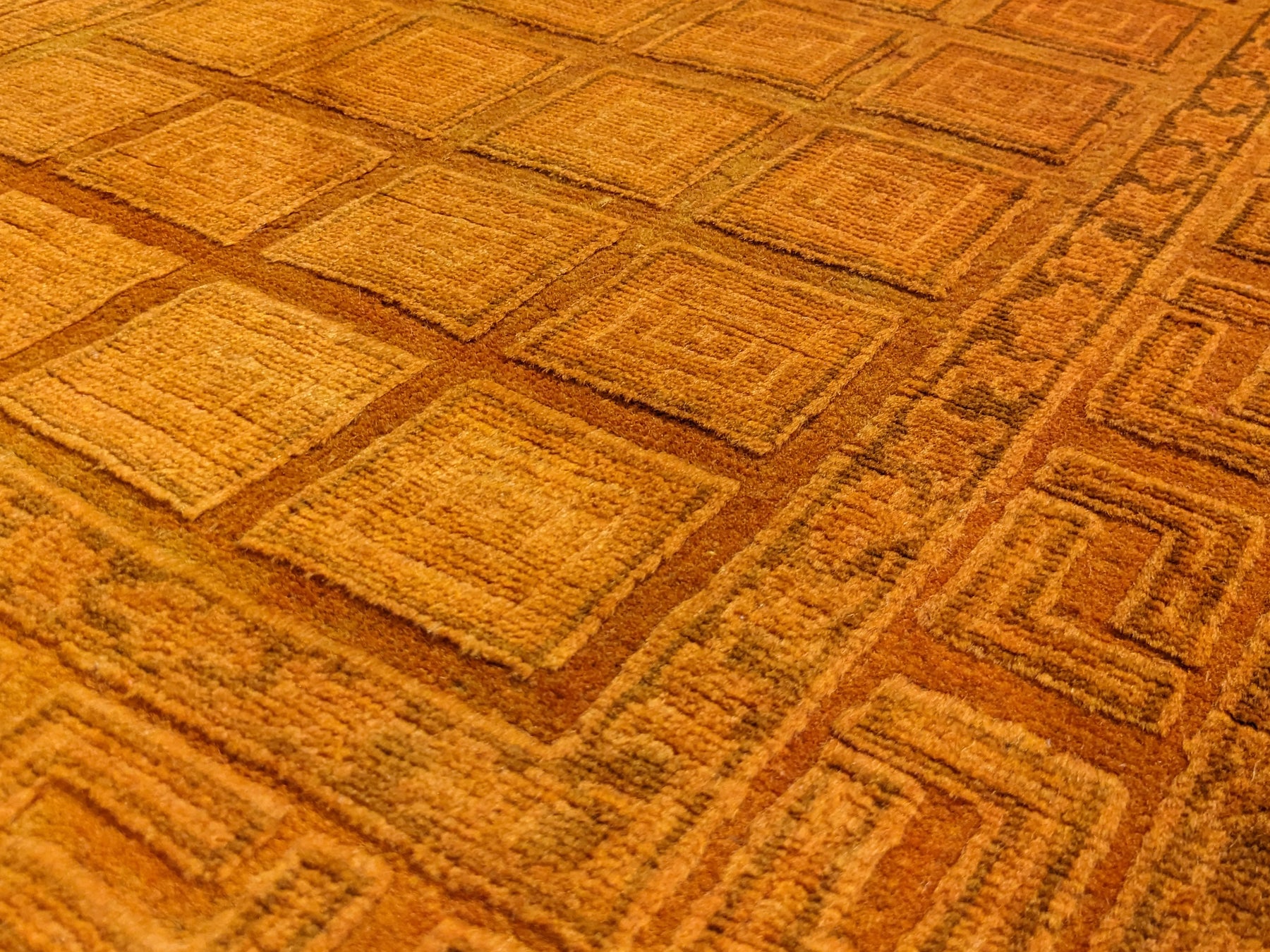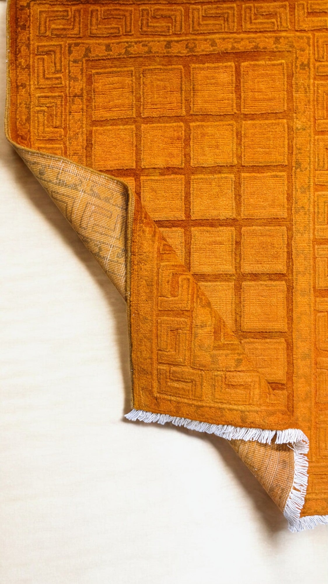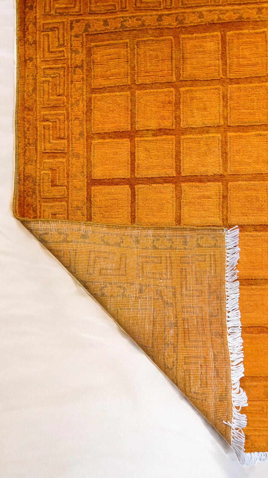 Sola radiates warmth with its golden orange tones and clean geometric symmetry. Hand-knotted with a medium pile, each panel reveals subtle texture and depth. A bold Greek key border frames the design, while a soft, pale fringe offers contrast. A cheerful, classic rug full of handmade charm.