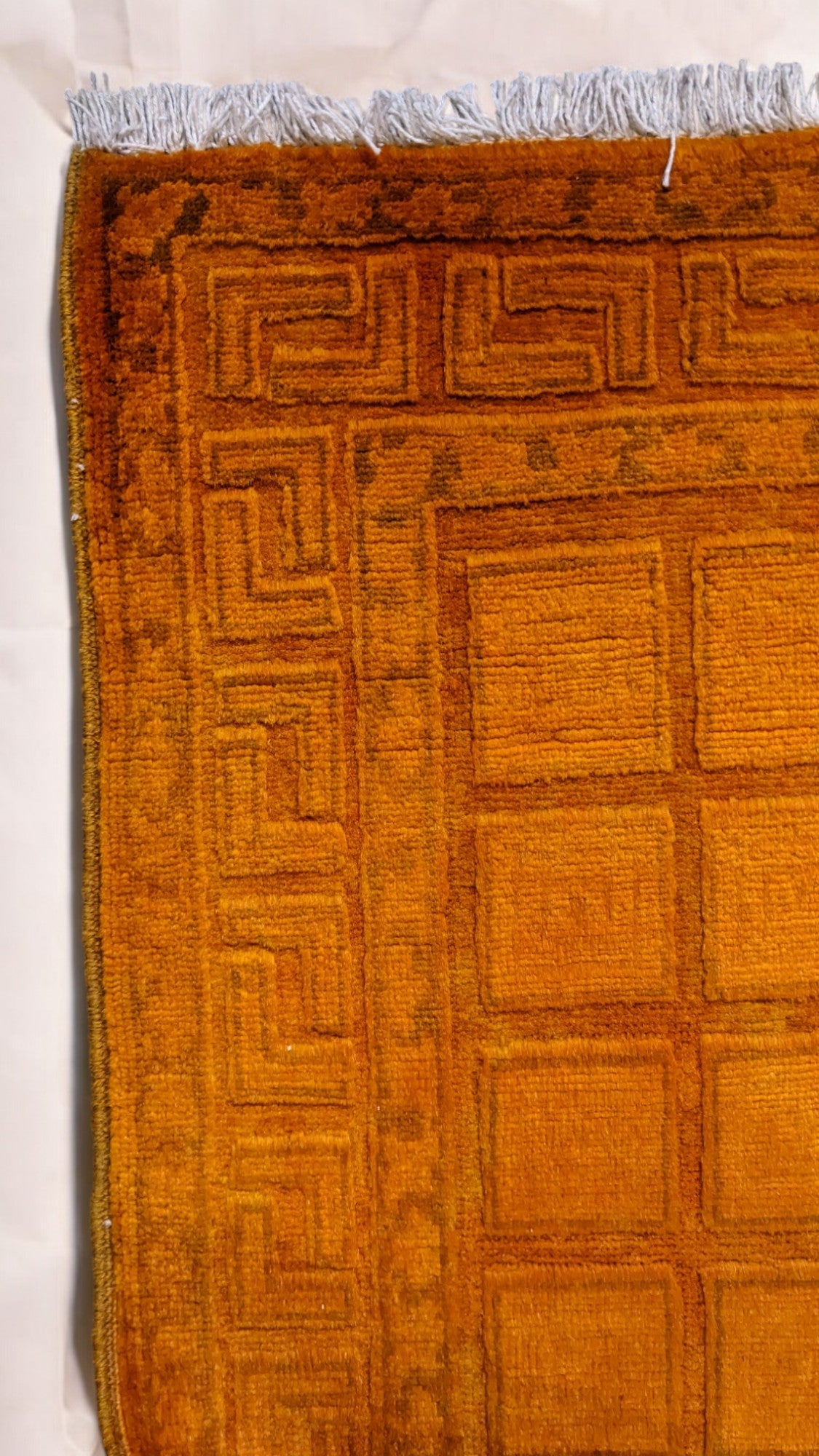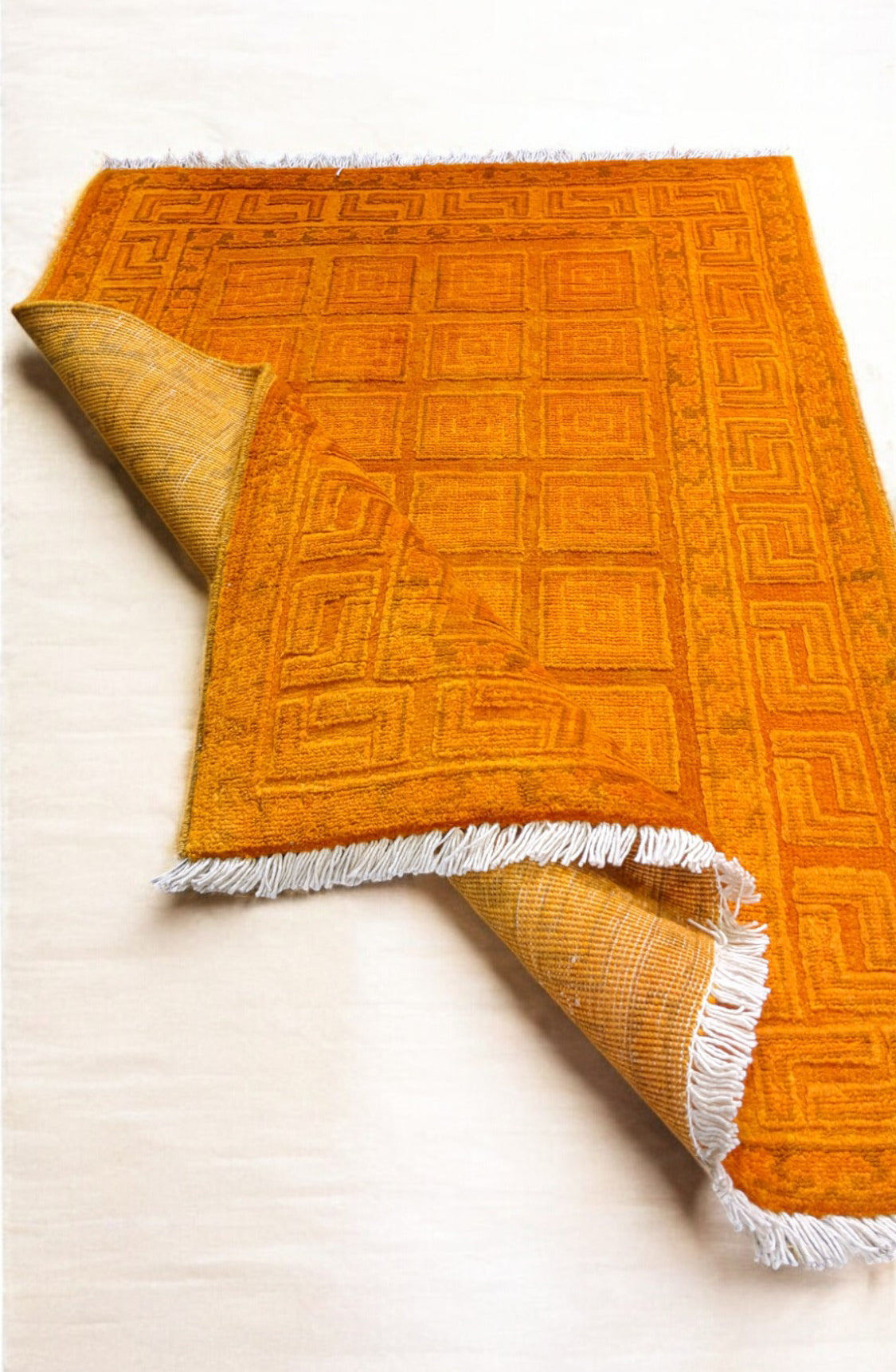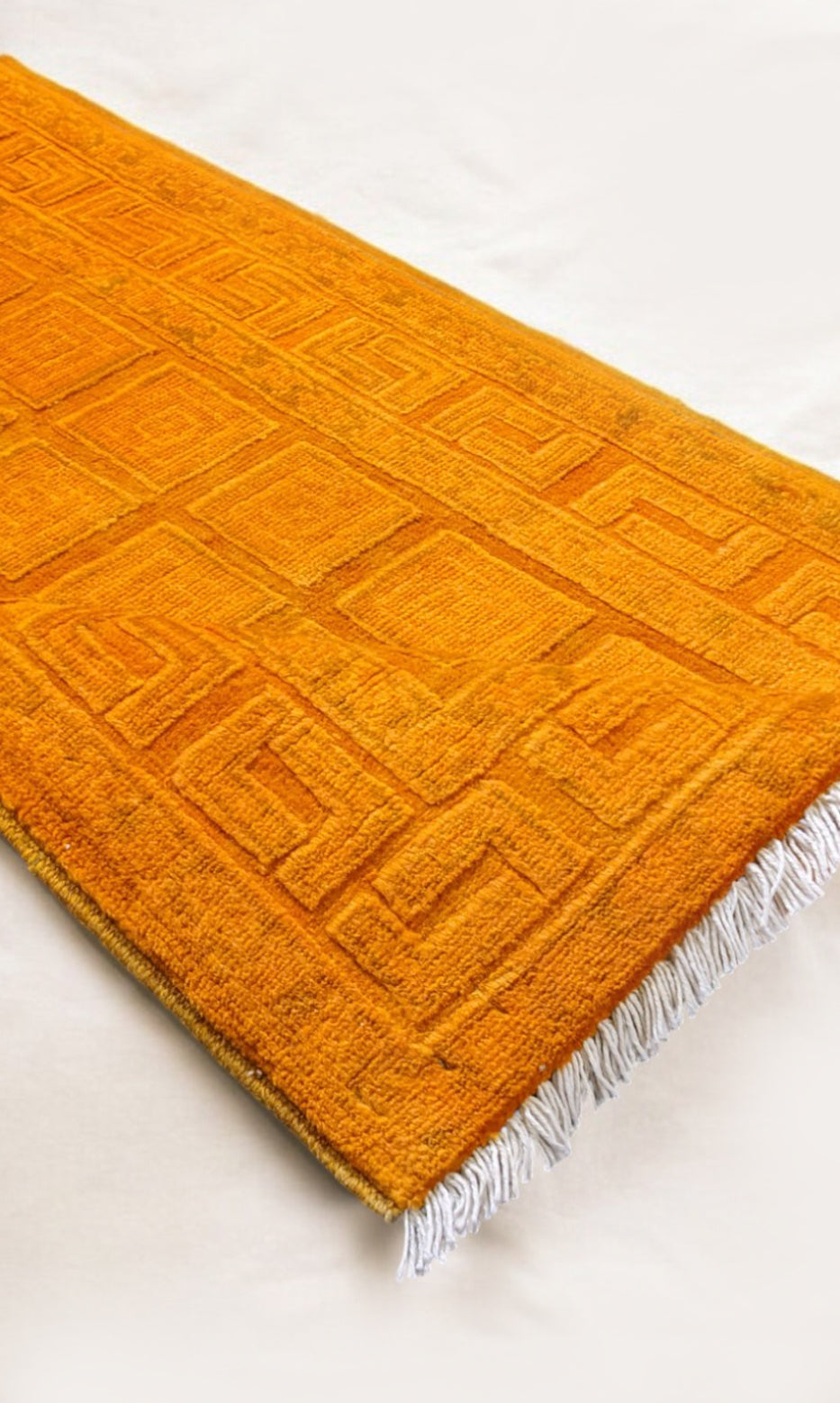 Sola radiates warmth with its golden orange tones and clean geometric symmetry. Hand-knotted with a medium pile, each panel reveals subtle texture and depth. A bold Greek key border frames the design, while a soft, pale fringe offers contrast. A cheerful, classic rug full of handmade charm.