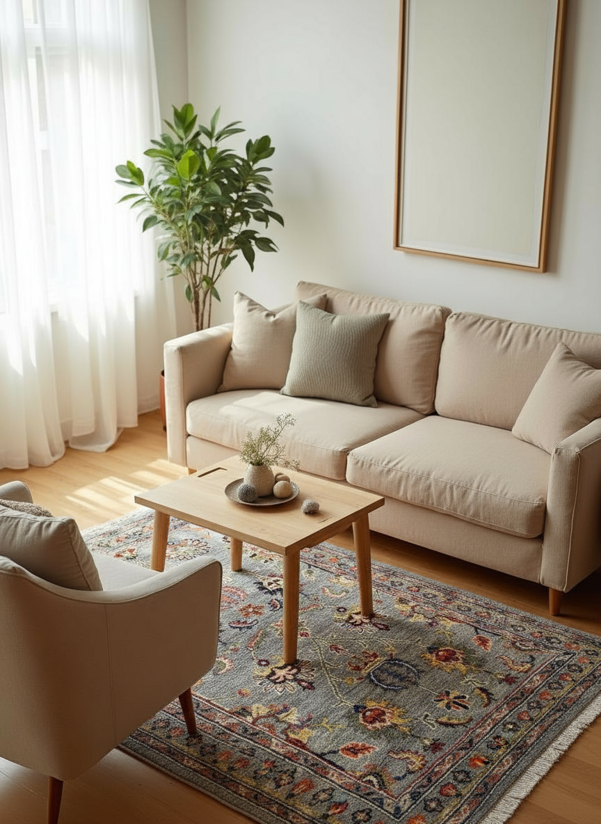 • The rug's colors and patterns shift dramatically with your perspective, coming alive in rich vibrancy when the fibers face you, softening to subtle elegance as they turn away. This inherent interplay is not a flaw, but an elevating quality that renders the rug an interactive work of art.