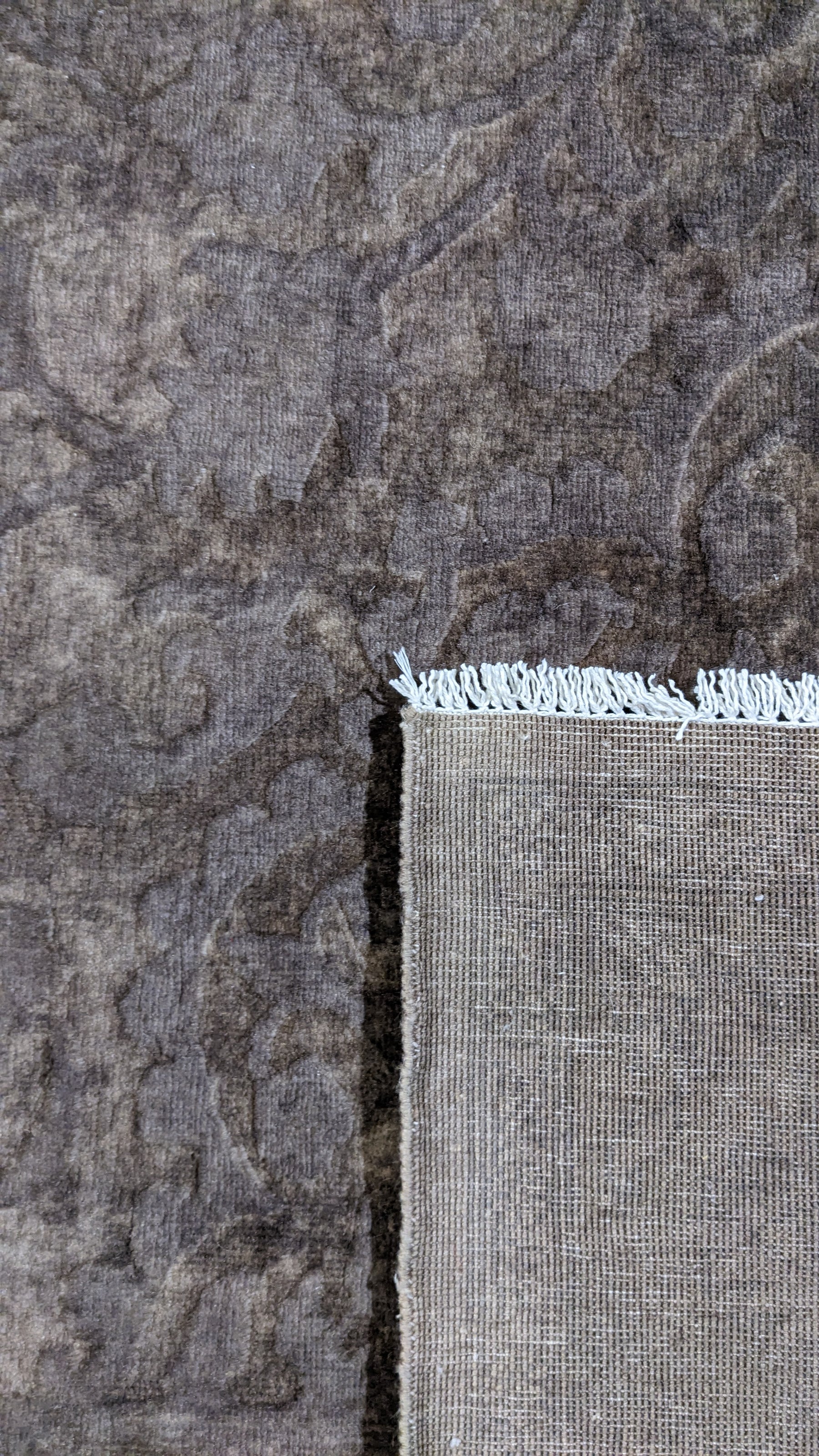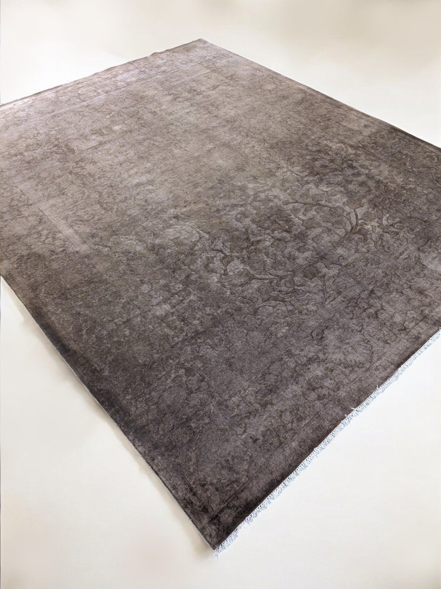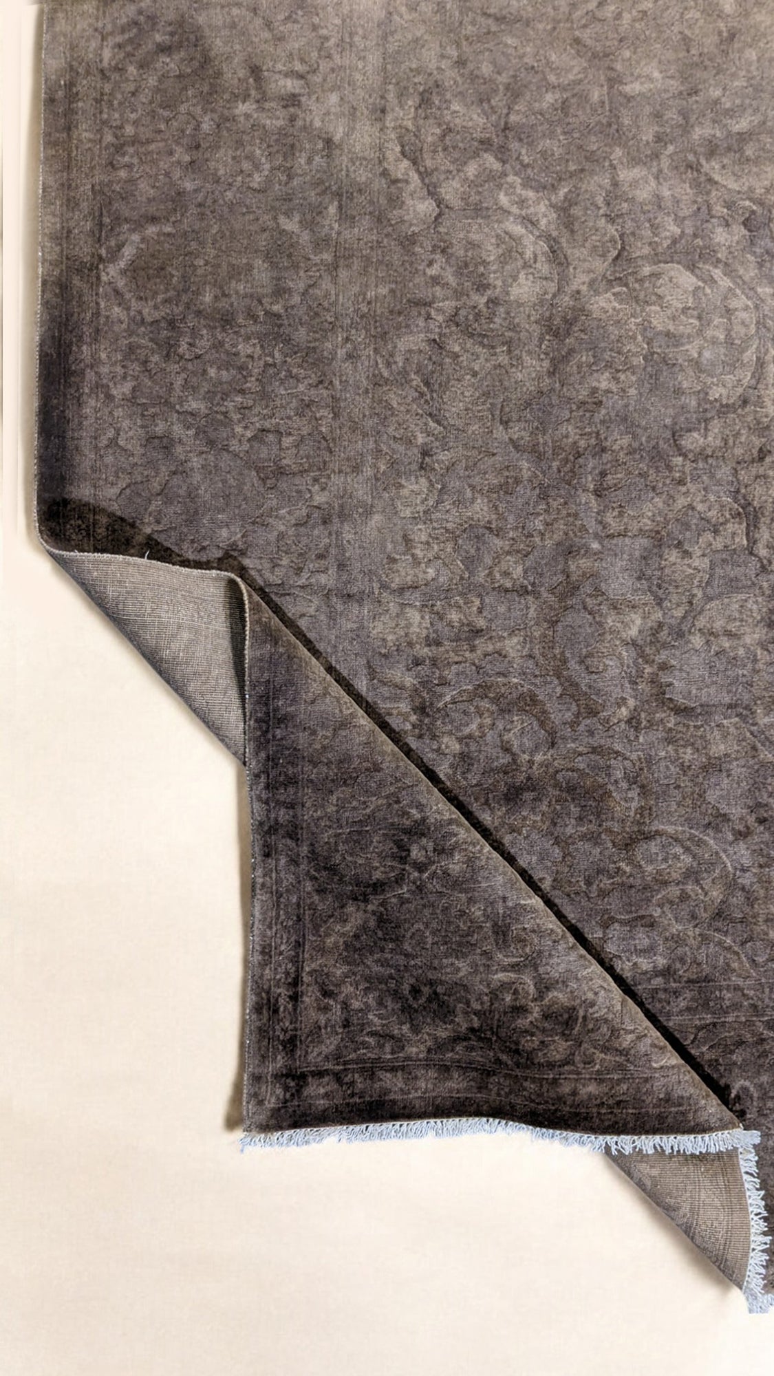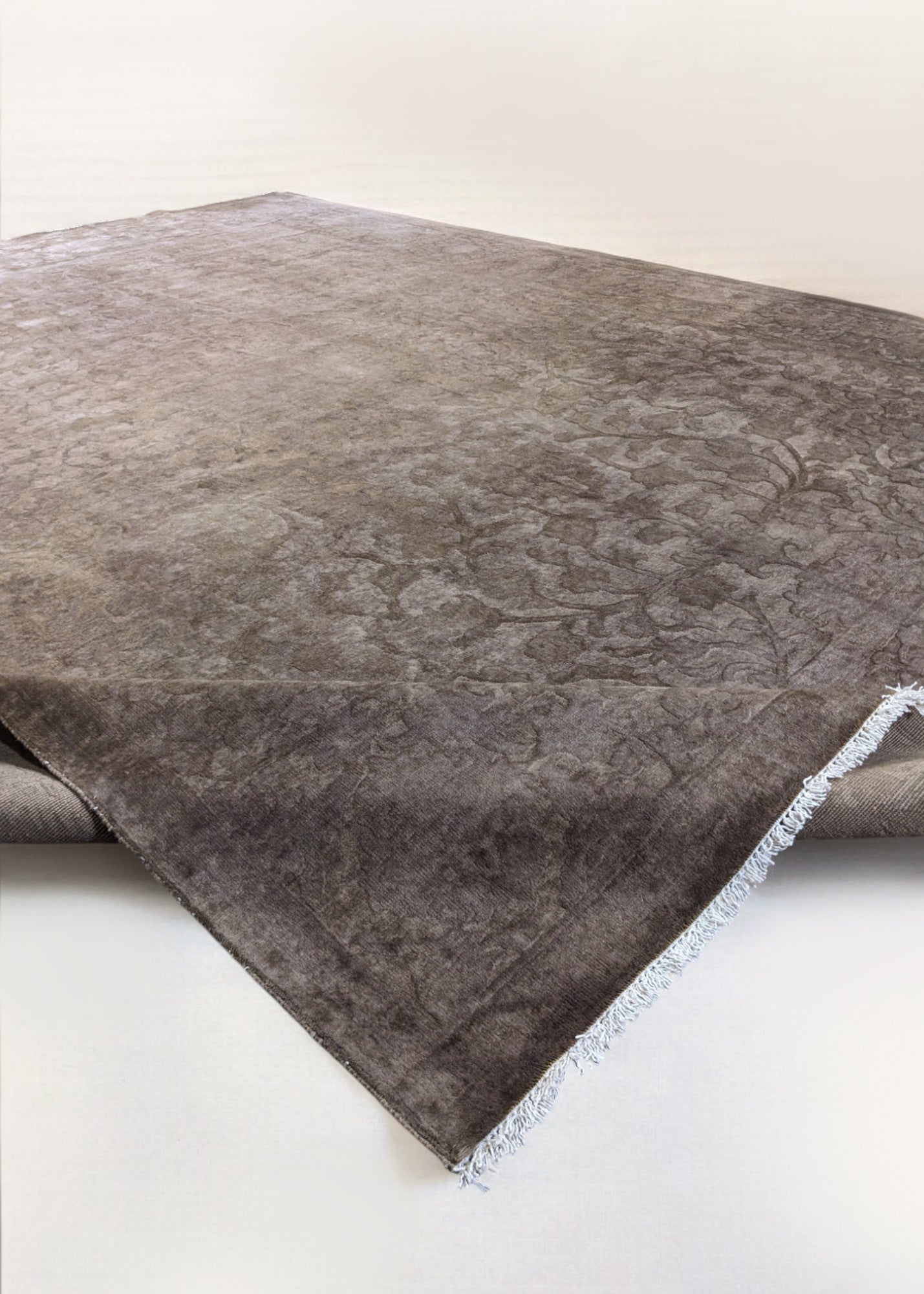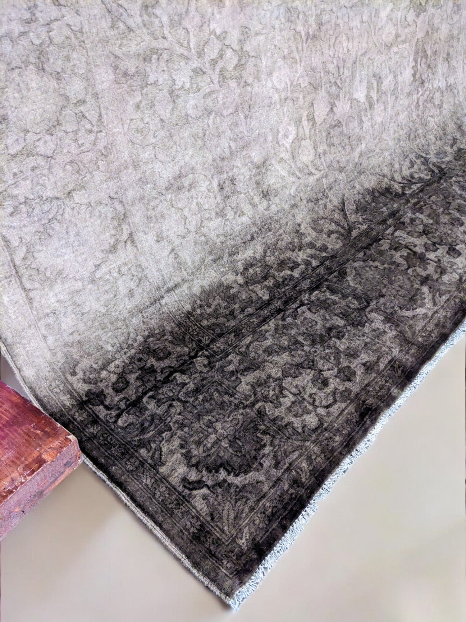 Kaiwha is understated elegance in motion. A seamless ombre flows from soft silver-gray to deep charcoal, where intricate floral patterns emerge with subtle drama. Its low-pile texture feels sleek and smooth underfoot, while the delicate pale fringe adds the perfect touch of contrast. Modern sophistication, with a nod to timeless design.