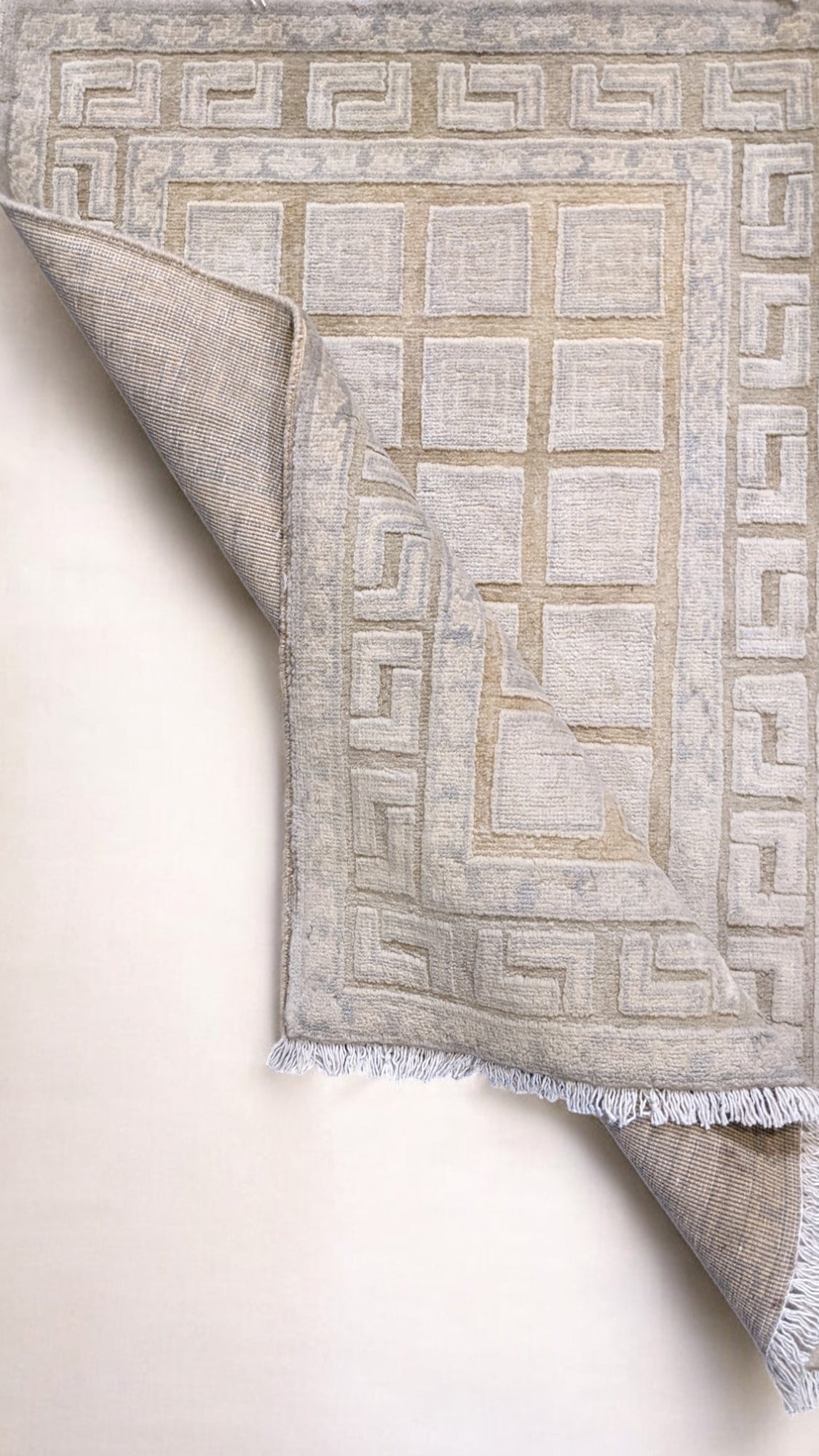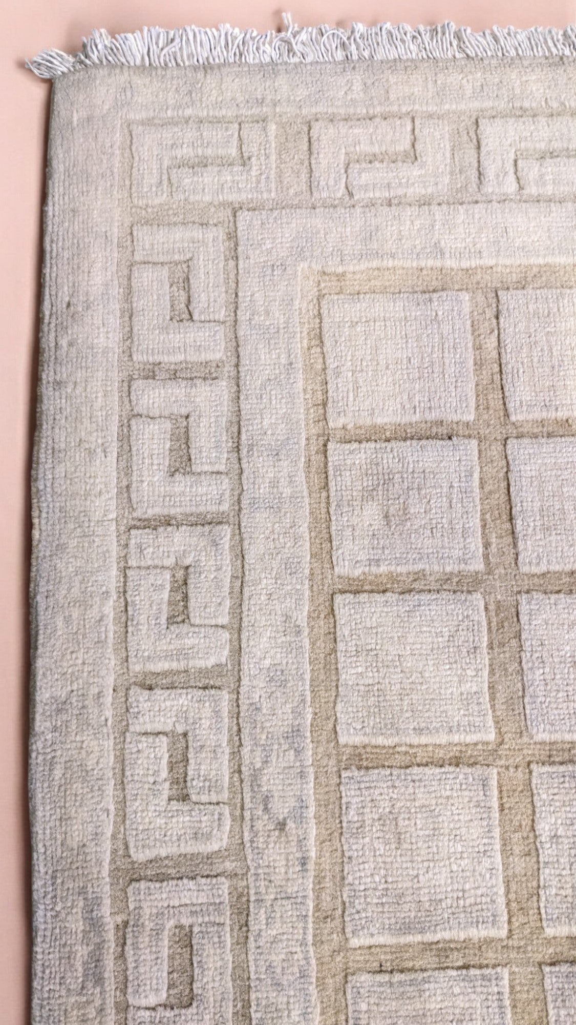 Handmade rugs by Ahsan Imam in natural and neutral tones, capturing the serene beauty of earthy desert landscapes.