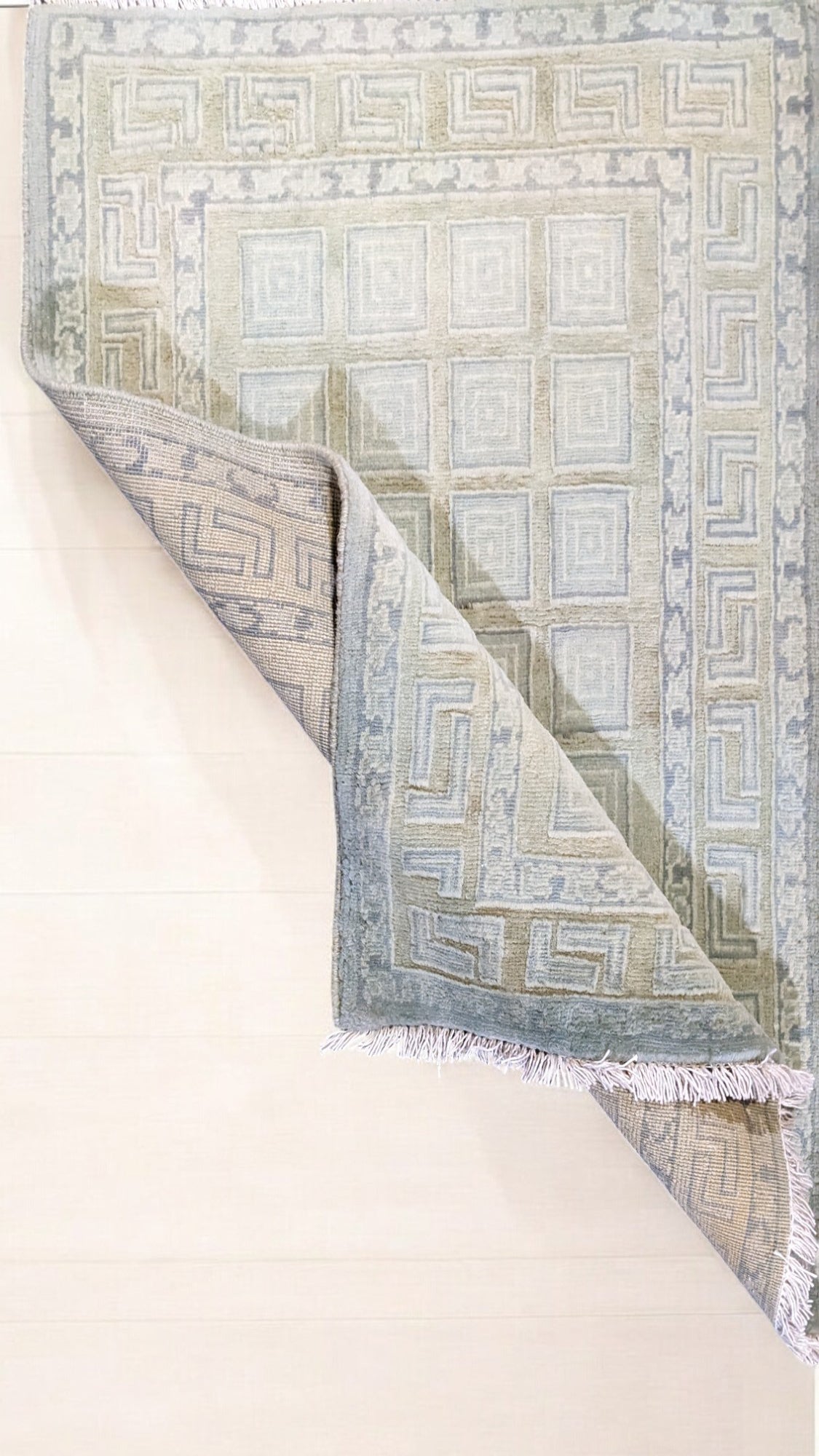 This hand-knotted wool rug showcases a calming sage green shade, highlighted by geometric patterns and a classic Greek key border. Its gentle textures and medium pile offer a refined and peaceful ambiance, complemented by a delicate light fringe that completes the sophisticated design.
