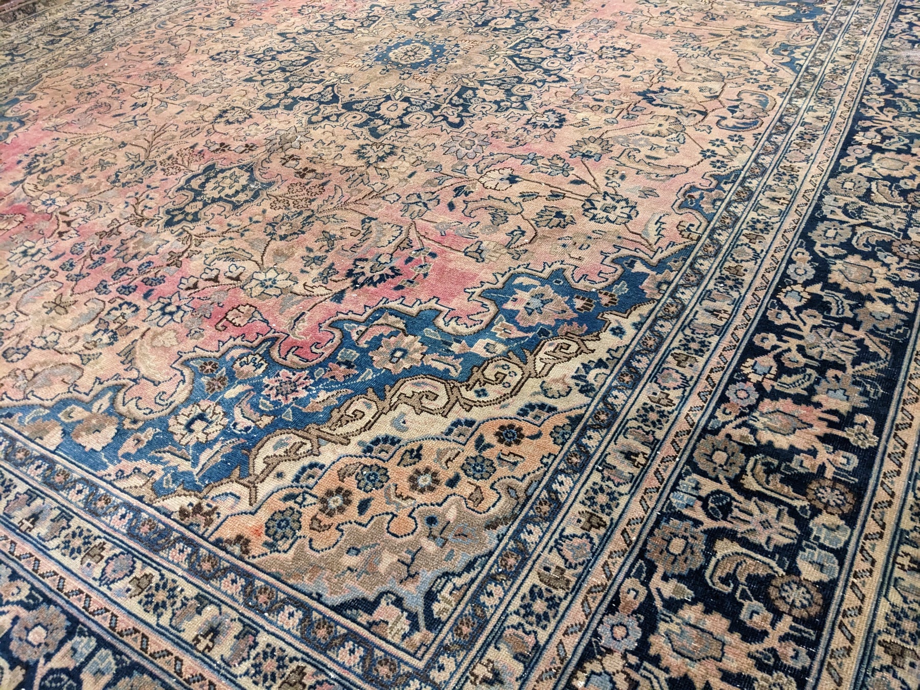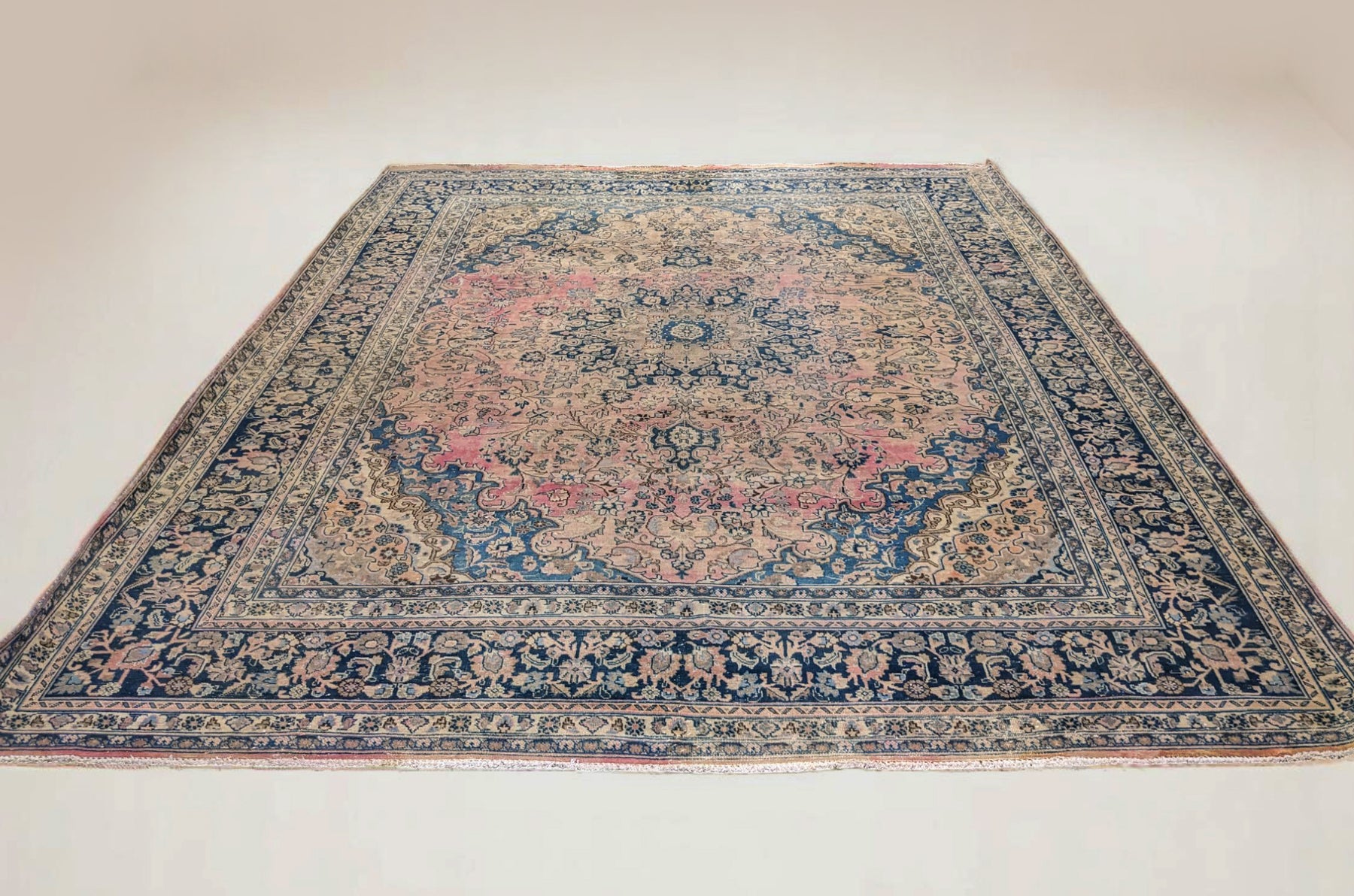 This vintage Persian wool rug embodies classic sophistication with striking contrast. Showcasing a deep navy medallion that expands into gentle blush and muted taupe hues, it is adorned with detailed floral patterns throughout. Expertly hand-knotted with a zero-pile finish and a distressed patina, the Caldor rug offers a sense of historical depth that is both majestic and approachable.